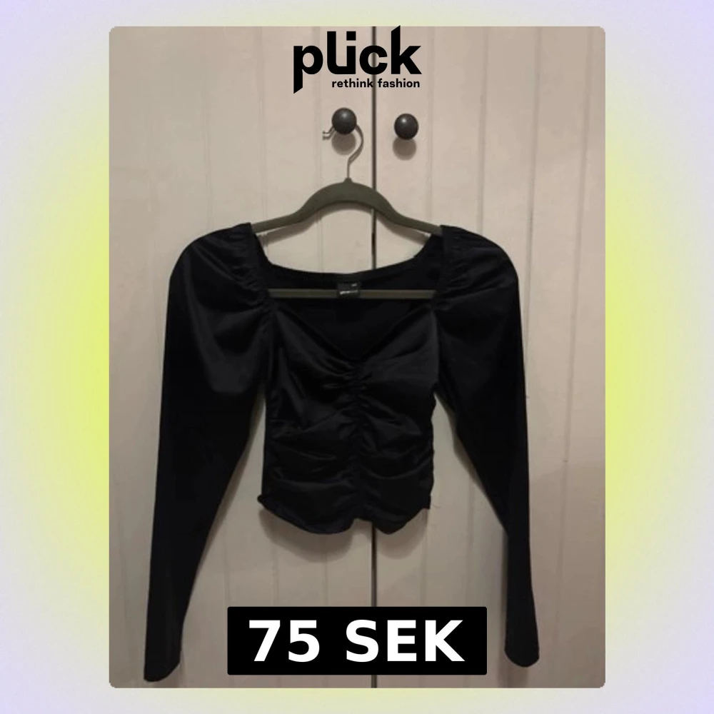 Trendig svart topp med långa puffärmar och rynkade detaljer framtill. Perfekt till fest. Materialet känns mjukt och stretchigt. XXS men passar även XS eller liten S