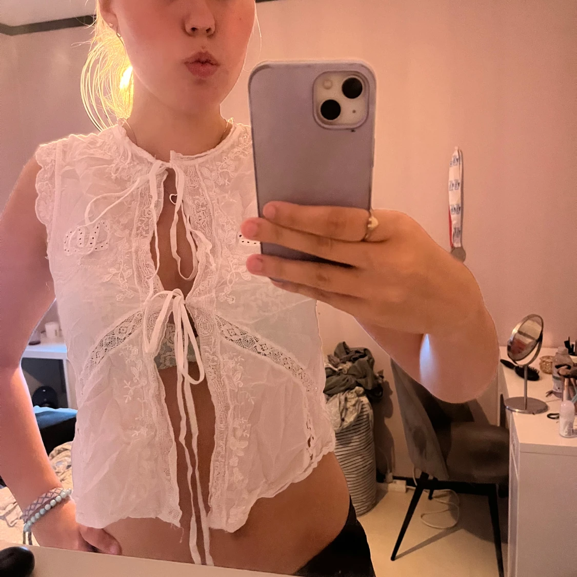 Säljer en genomskinlig fest topp från Zara. Den har 2st knuten i mitten och har mönster på. Använd 2 gånger. Köpt för 300-400kr