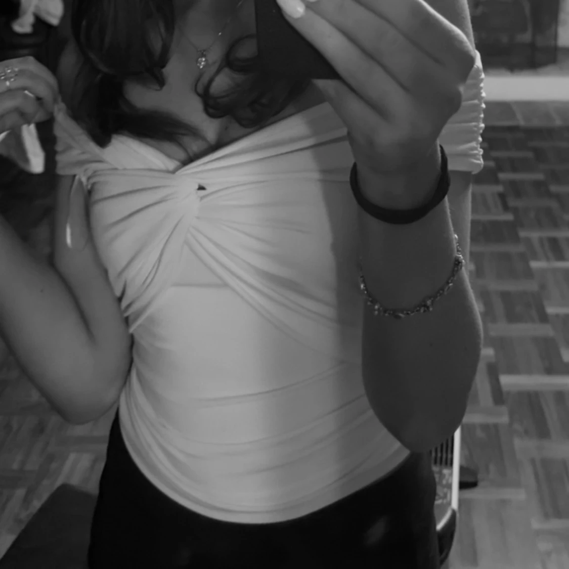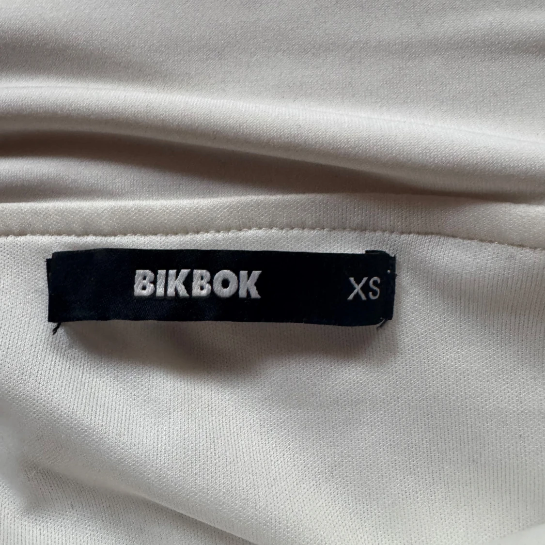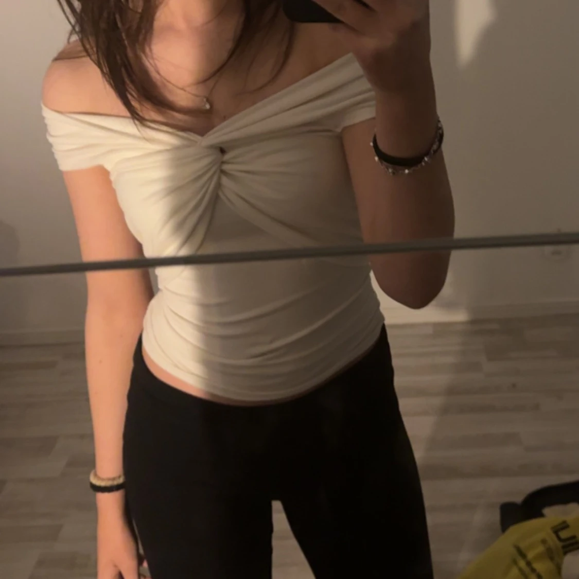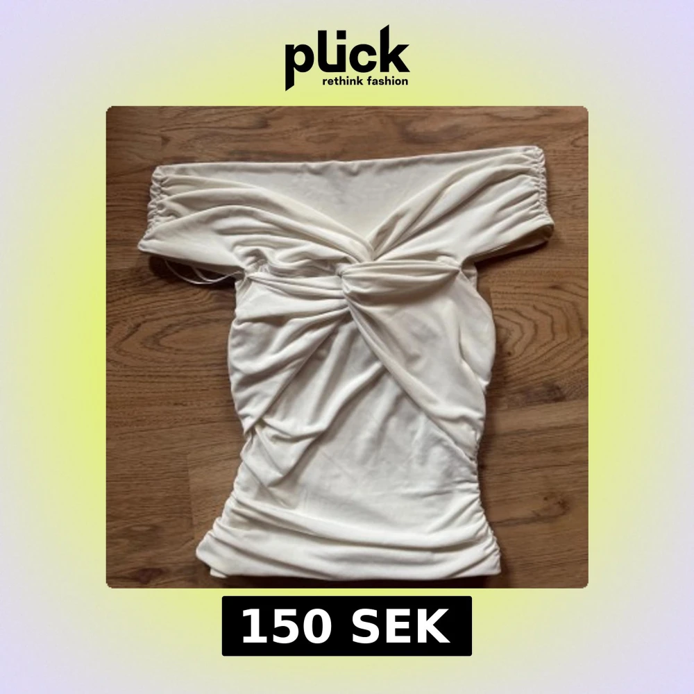Säljer en vit offshoulder topp från BikBok i storlek XS. Tight passform med snygg rynkdetalj och twist framtill. Perfekt för dig som vill ha en stilren och trendig look.