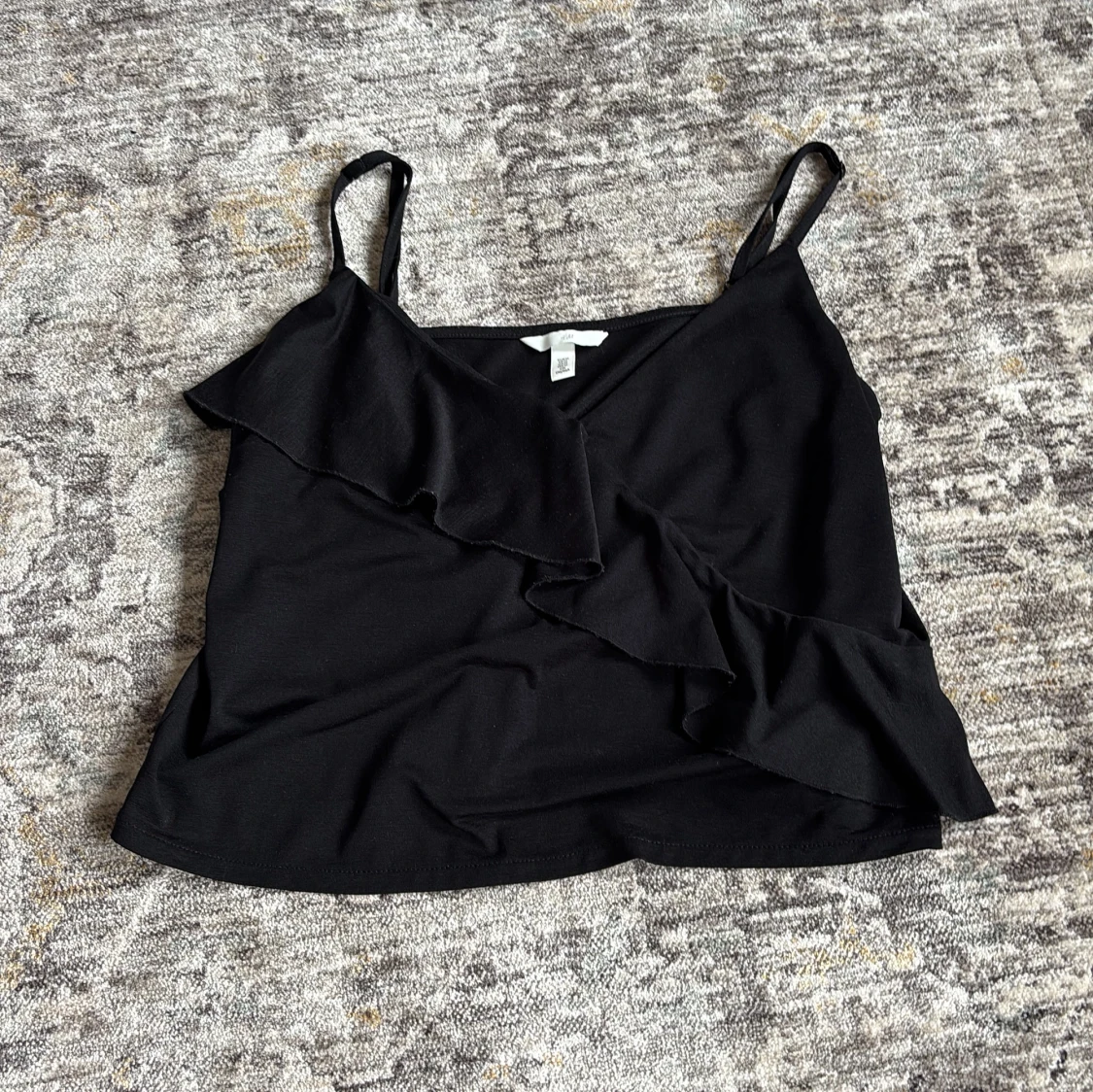 Säljer en svart fest topp med smala axelband och snygga volangdetaljer framtill.