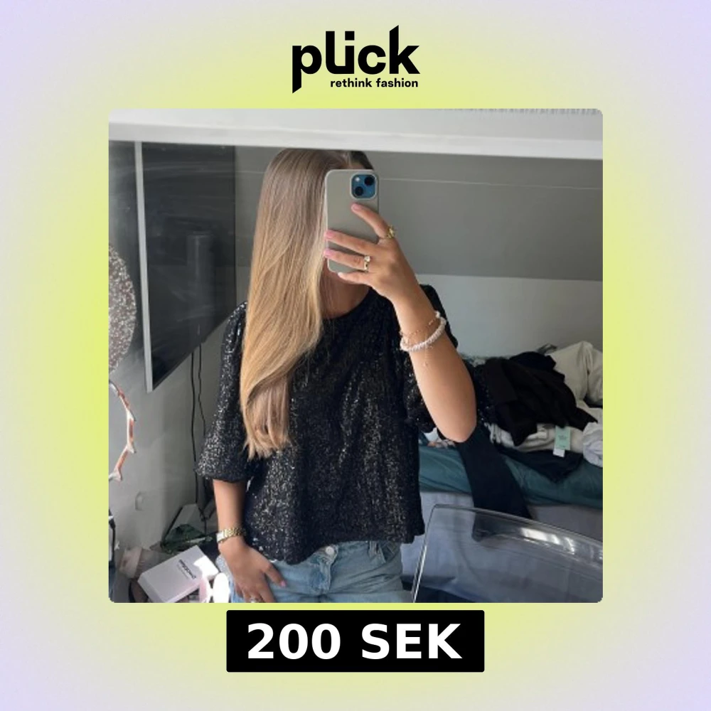 Säljer en svart glittrig topp från Stockh LM i storlek S. Toppen har paljetter, rund halsringning och halvlånga, lite puffiga ärmar. Perfekt nät man vill vara lite mer festlig! Klicla gärna på ”köp nu”!