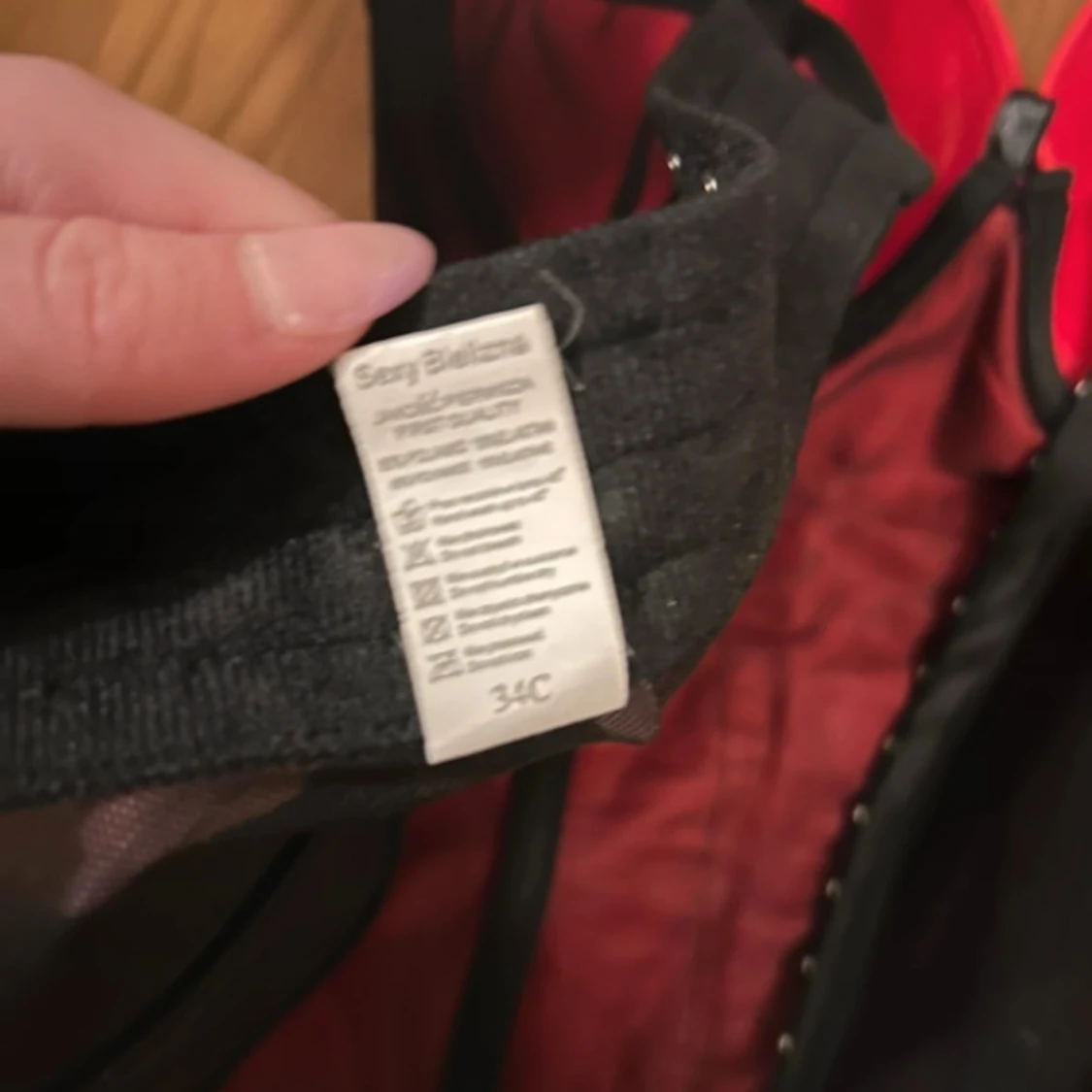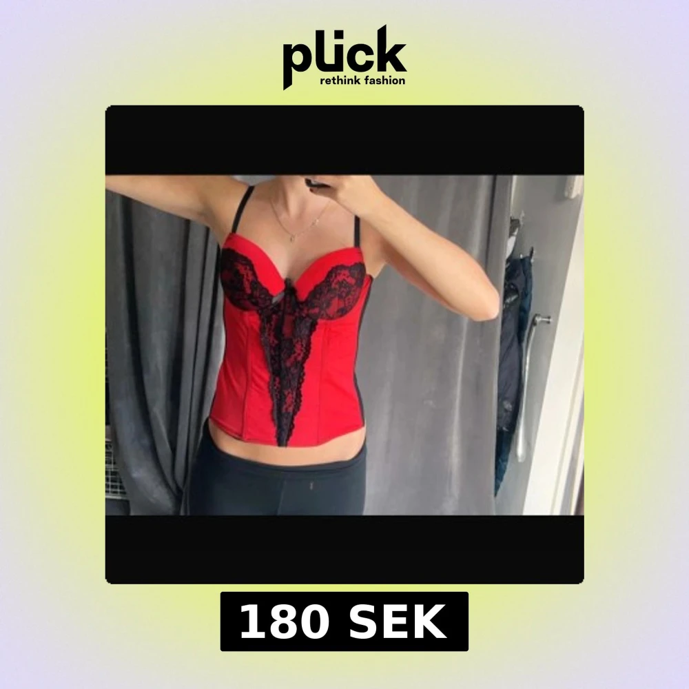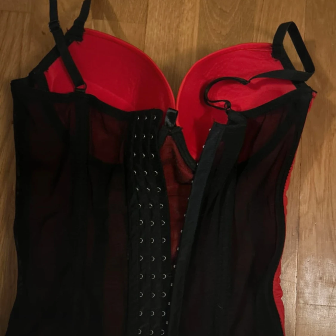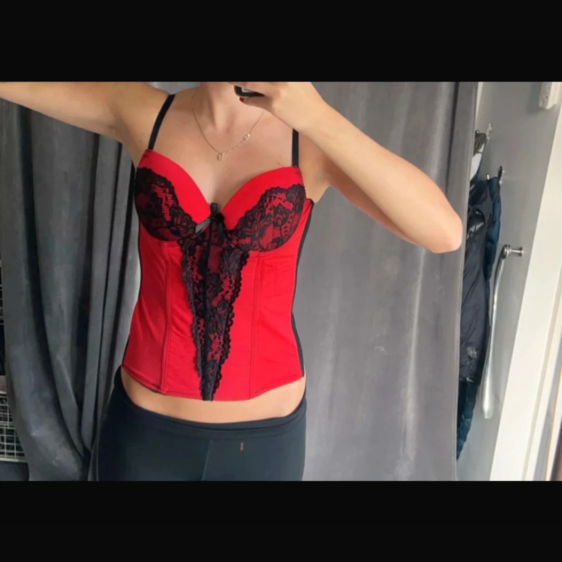 Snygg röd korsett med svarta spetsdetaljer och justerbara axelband. Den har en hakknäppning bak och är i 34 C