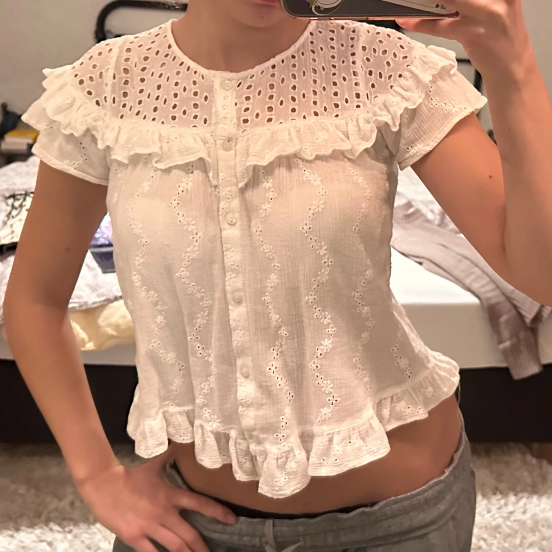 Säljer denna supersöta vita blus med volangdetaljer och broderade mönster. I väldigt bra skick!😆 Köpt på Zaras barnavdelning men den sitter som en S