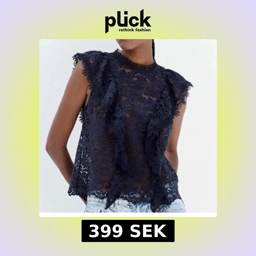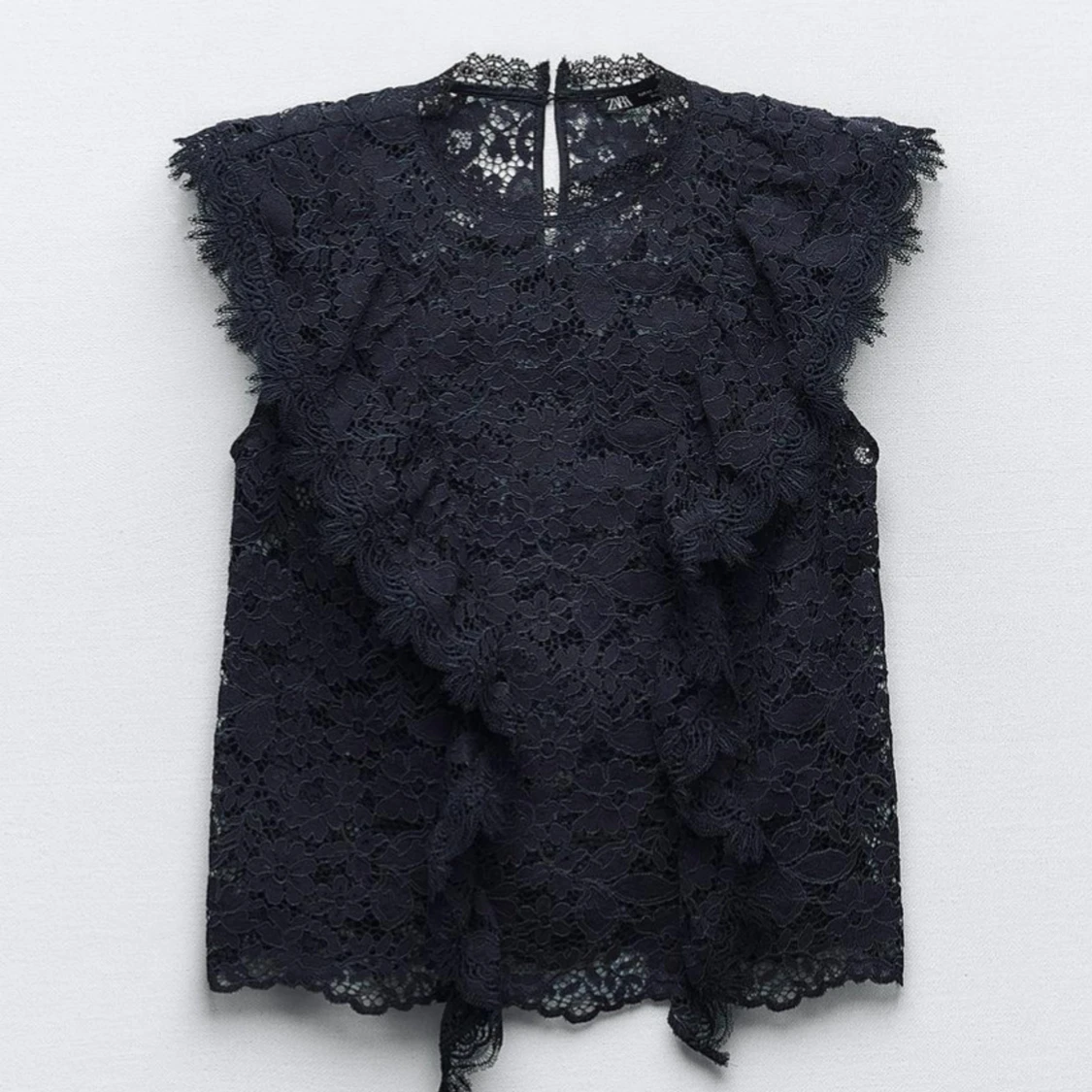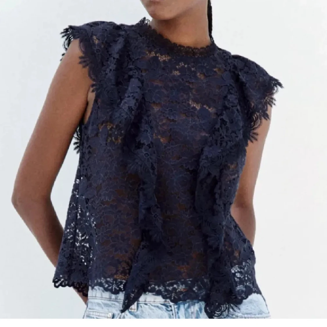 Säljer denna supersnygga mörkblå blusen i spets från Zara med volangdetaljer!!💘Använd 3 gånger, har inga defekter alls!☺️Passar både XS och S.
