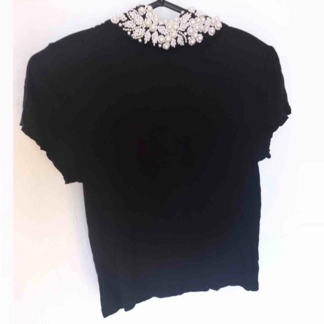 Festlig svart topp med dekorativ polo. Vita detaljer. Kortärmad. Fint skick!
