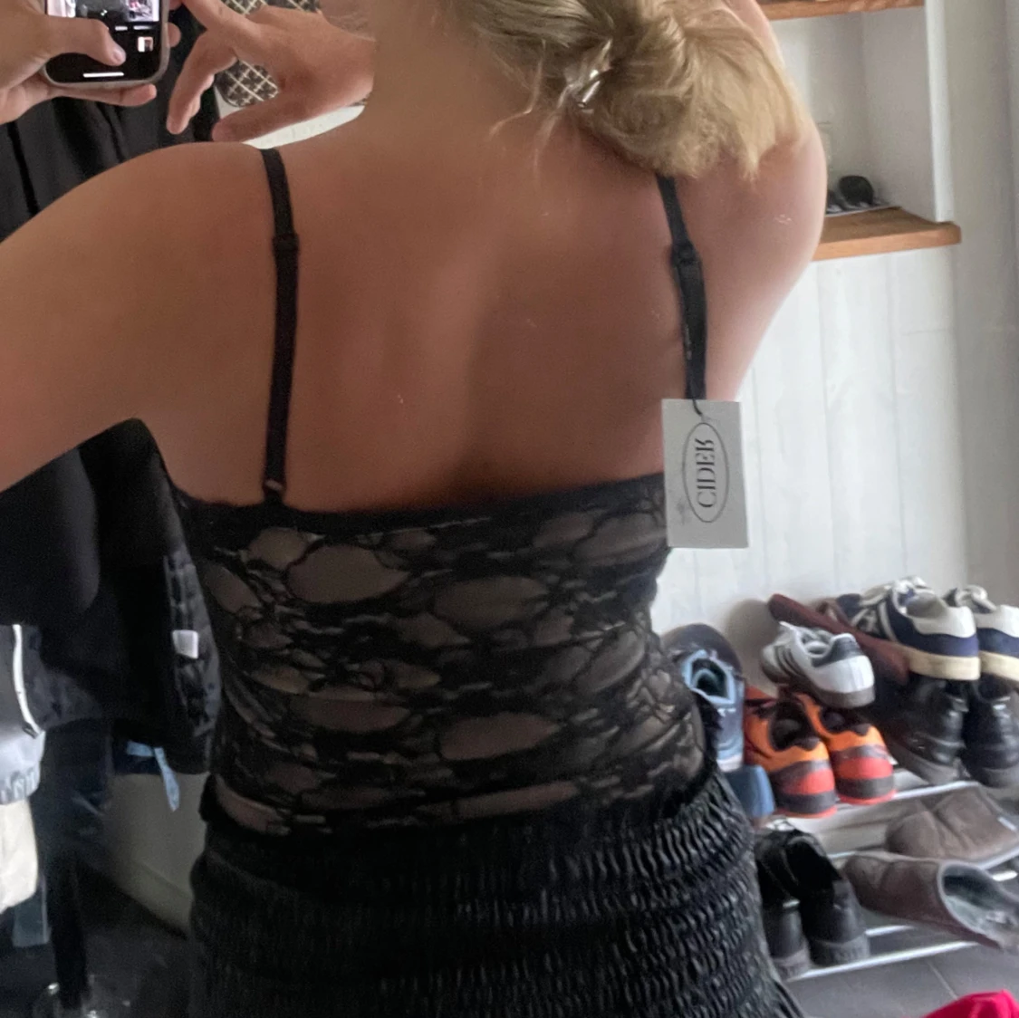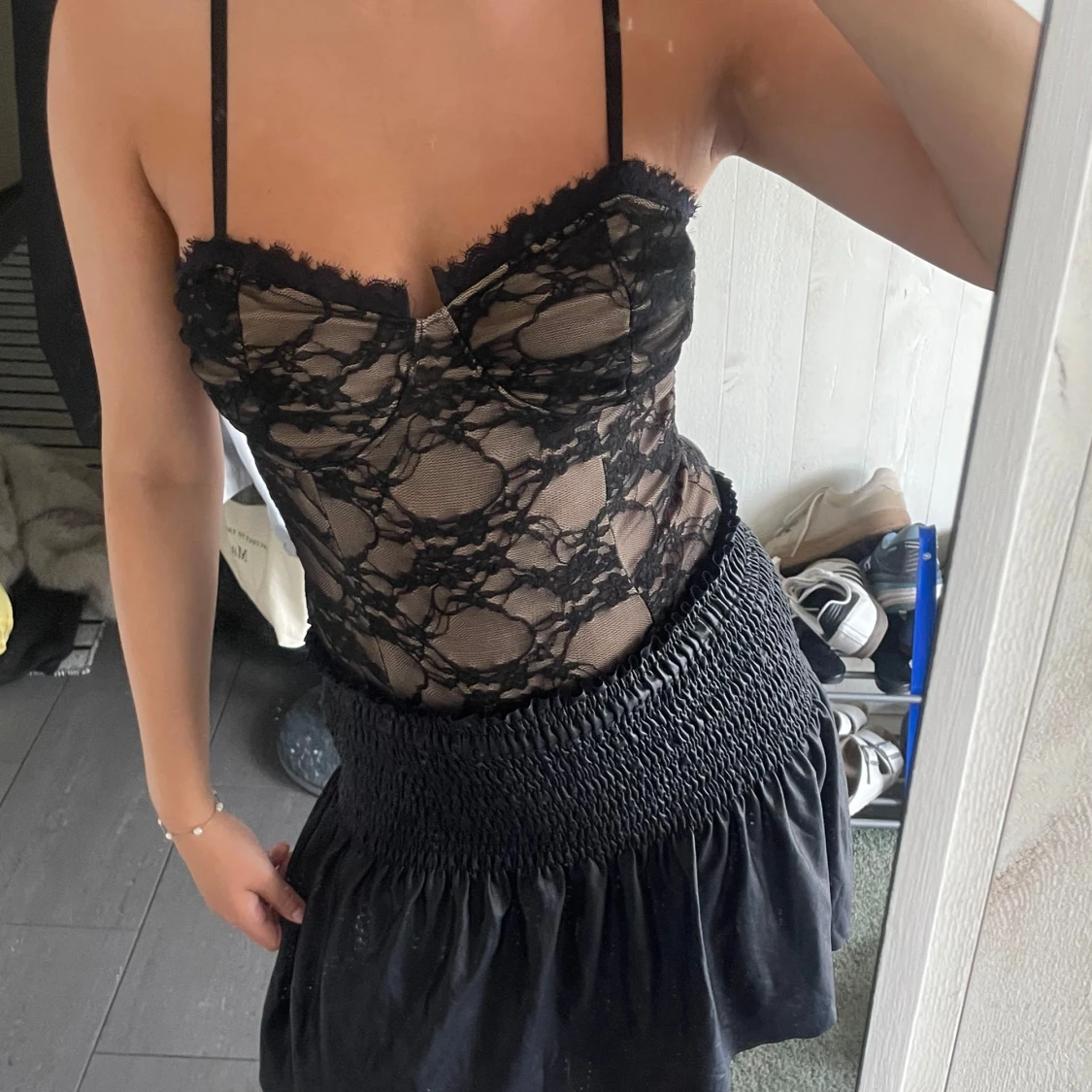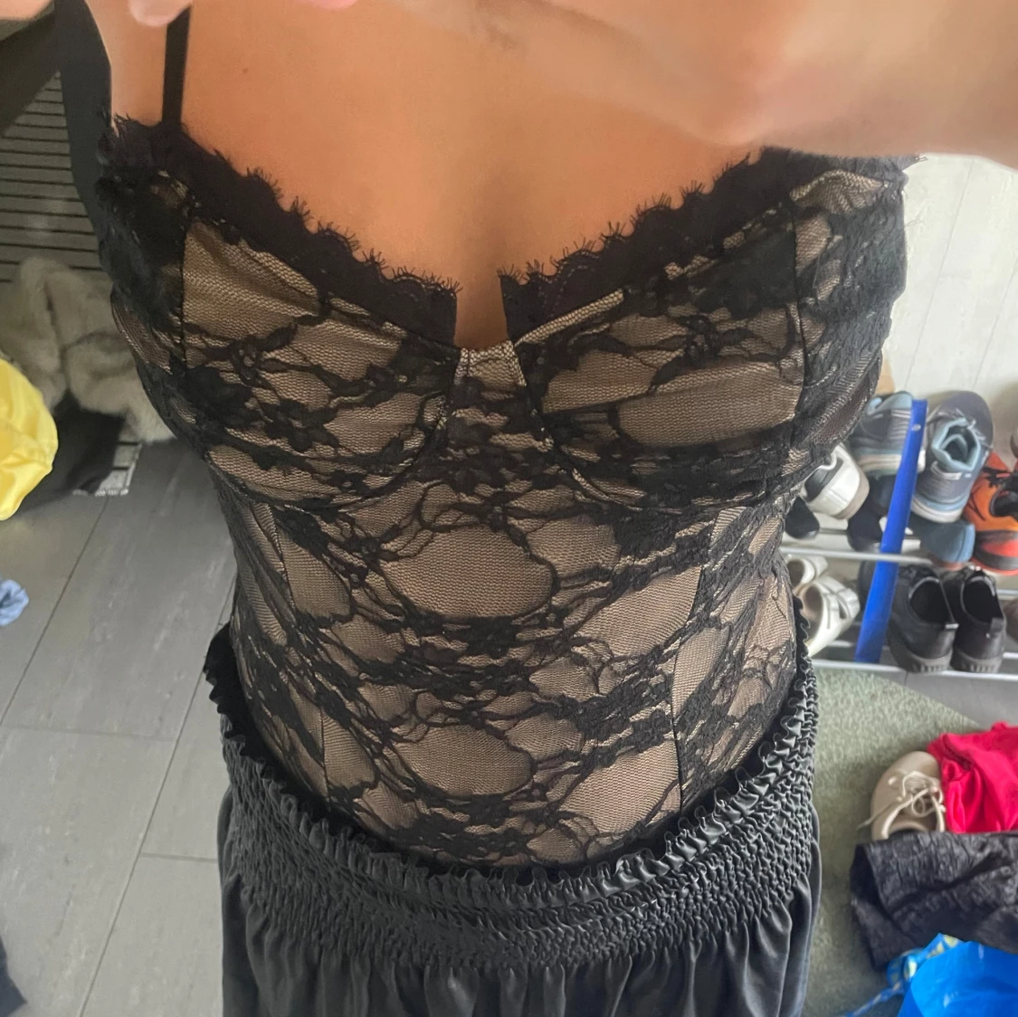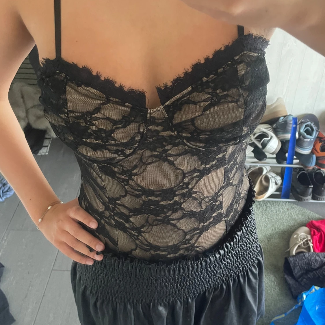 Säljer en snygg spetsbody med transparent spets och tunna axelband. Toppen har en markerad byst, dekorativ spetskant upptill och figurnära passform. Perfekt för dig som vill ha en edgy och trendig look.
