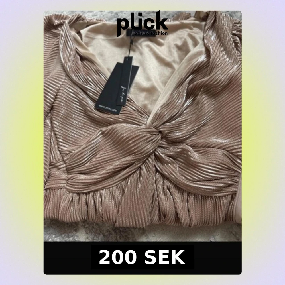 Supersnygg glittrig klänning från Jus de Pom i champagnefärg med twistad detalj framtill. Plisserad struktur och v-ringad halsringning ger en lyxig känsla. Perfekt för dig som vill sticka ut lite extra.