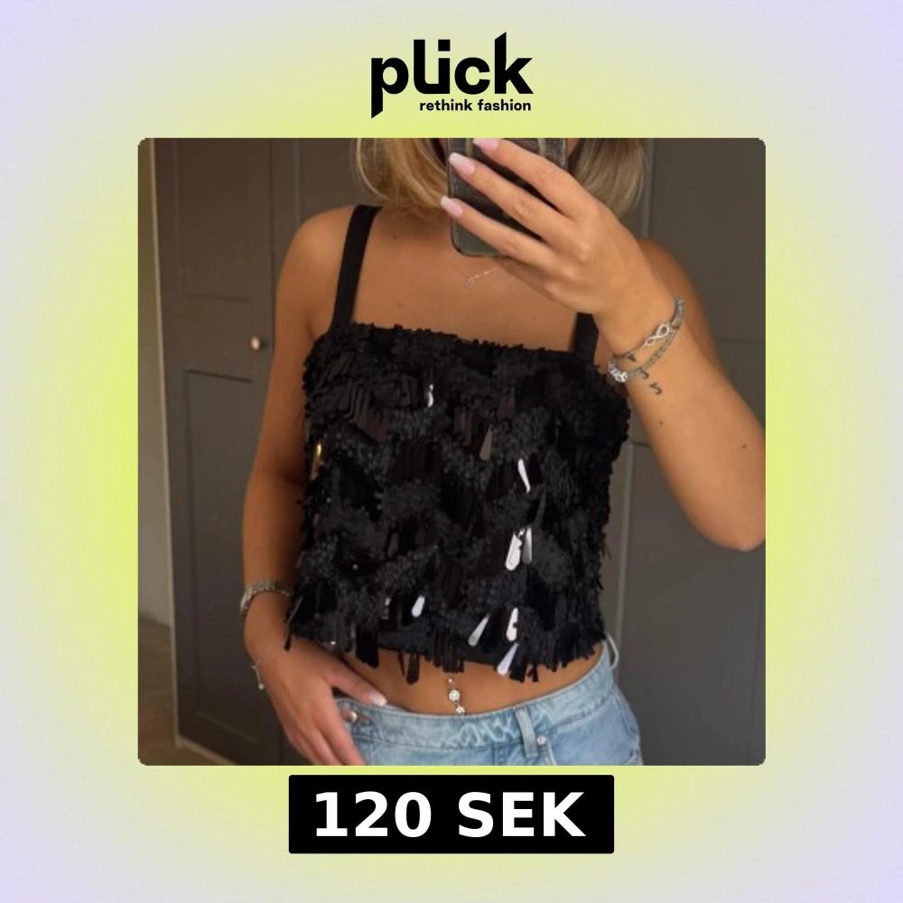 Toppen har en fyrkantig halsringning och är täckt av svarta och silvriga paljetter som ger en riktigt festlig look. Perfekt att styla med jeans eller kjol för en cool outfit.