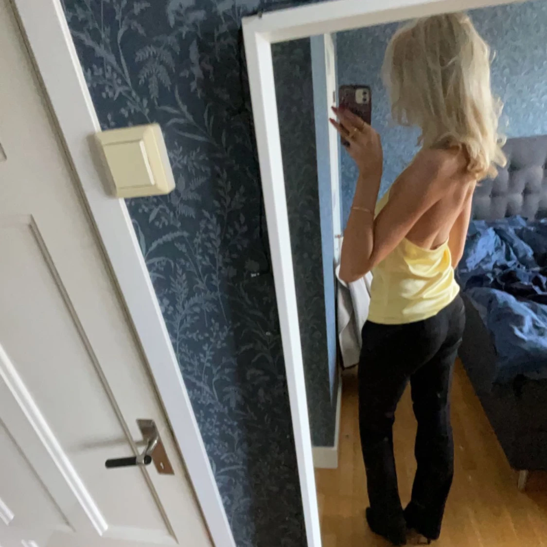 Säljer en snygg gul ärmlös topp med djup urringning och öppen rygg. Perfekt för varma dagar eller en utekväll. Toppen har en lös passform som ger en avslappnad och stilren look.