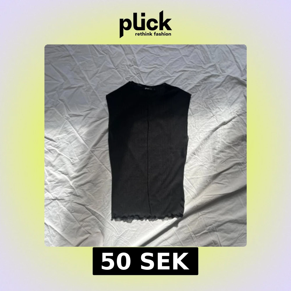 Snygg svart ribbad topp från Gina Tricot. Den är ärmlös och har en enkel design med en liten vågig kant vid nederdelen.