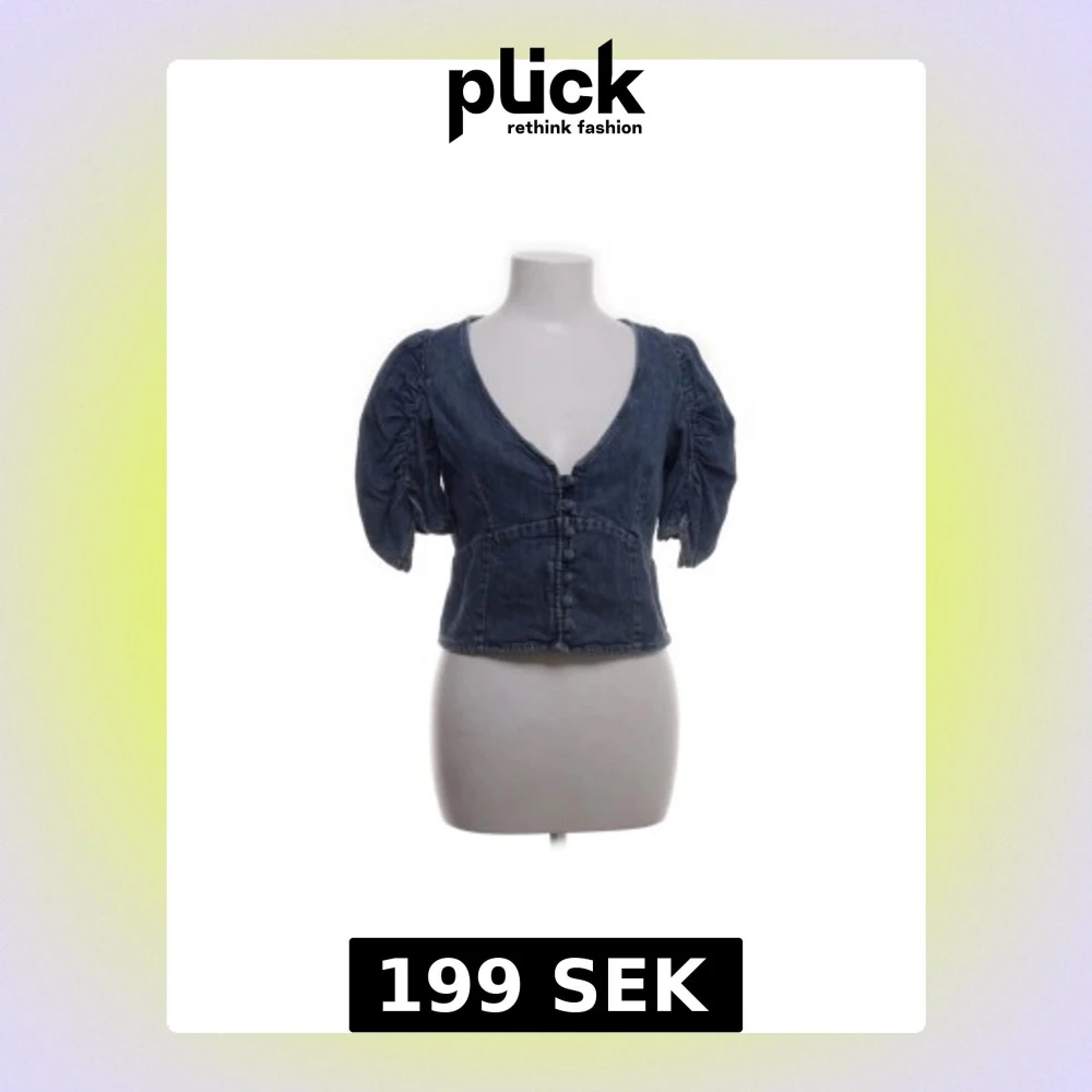 Säljer en blå denim blus från Levi's i storlek XS. Blusen har puffiga korta ärmar, v-ringning och knappar framtill. Croppad passform som ger en cool siluett. Perfekt för dig som gillar jeansmaterial och vill ha en unik topp i garderoben.
