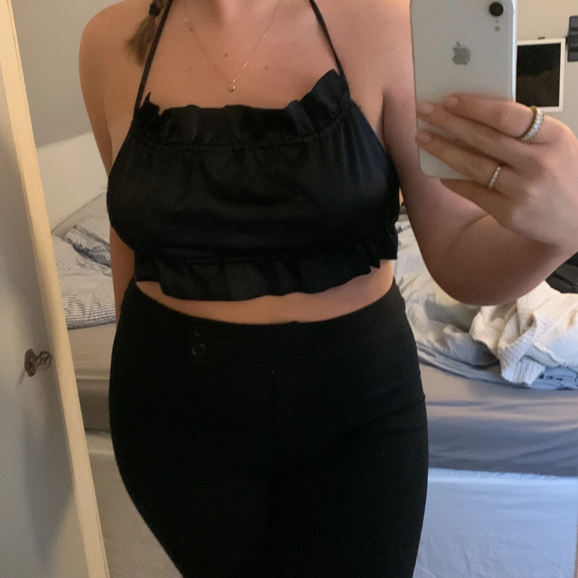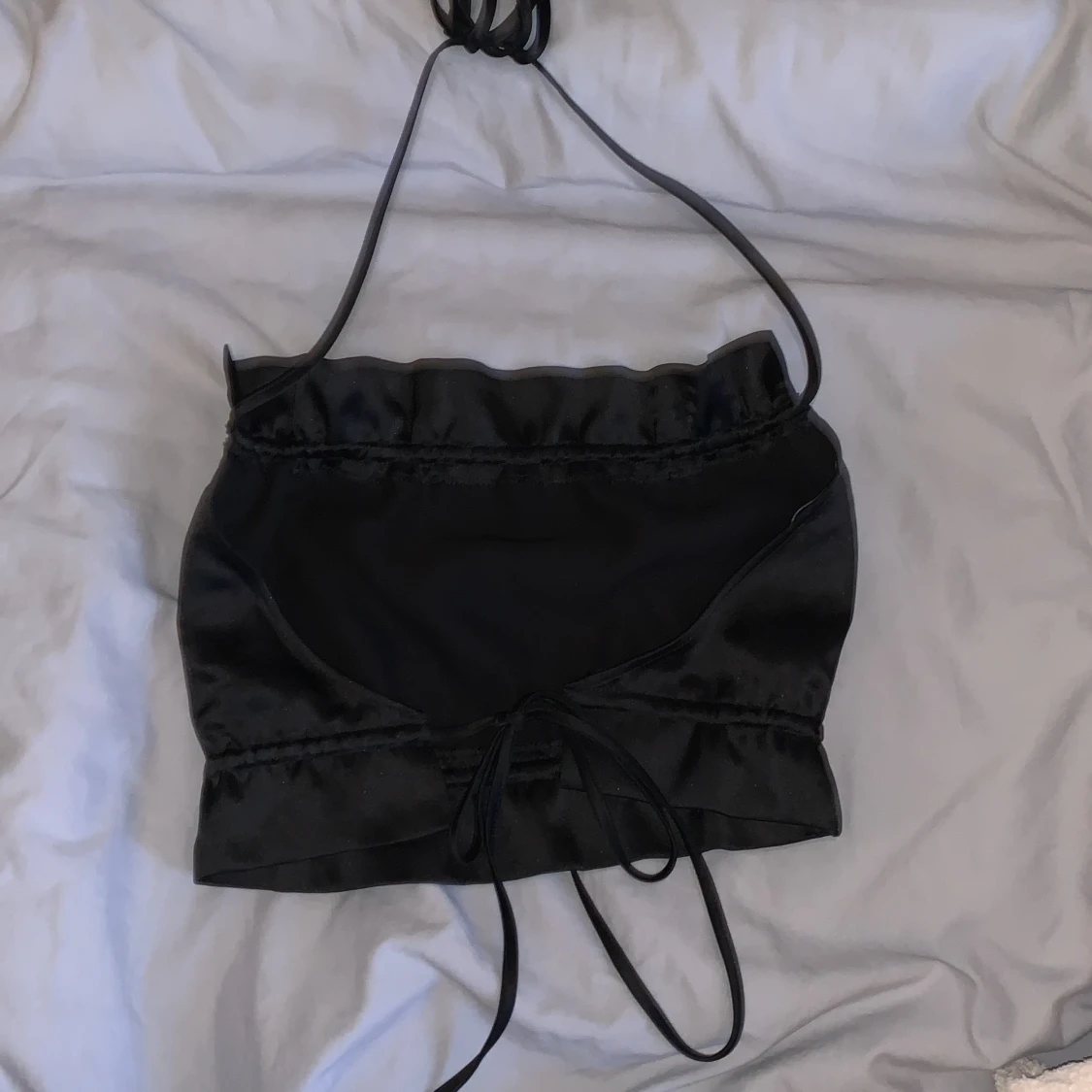 Svart satin topp som är öppen i ryggen, man knyter toppen i ryggen med snören, lite kort för mig då bysten blir för stor för toppen så skulle säga att den passar S!