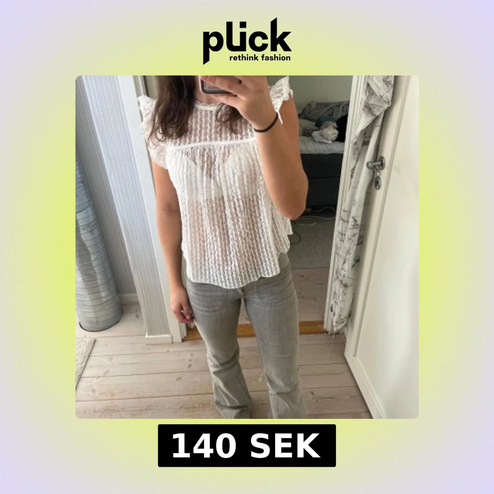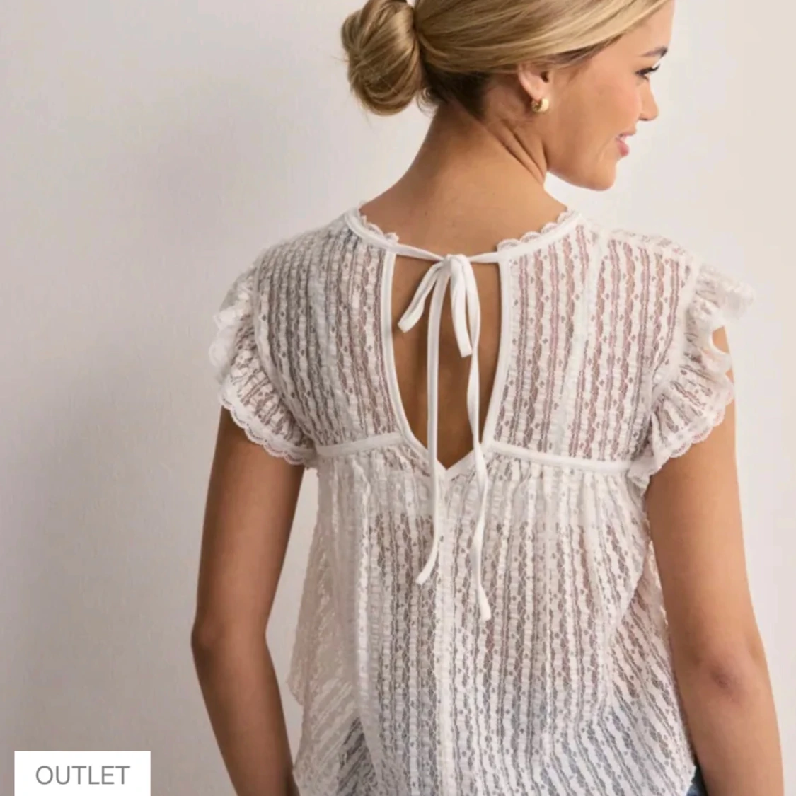 Supersöt vit blus i spets från Nelly med rund hals. Blusen är transparent, har fina spetsdetaljer och knytning i nacken. Storlek S.