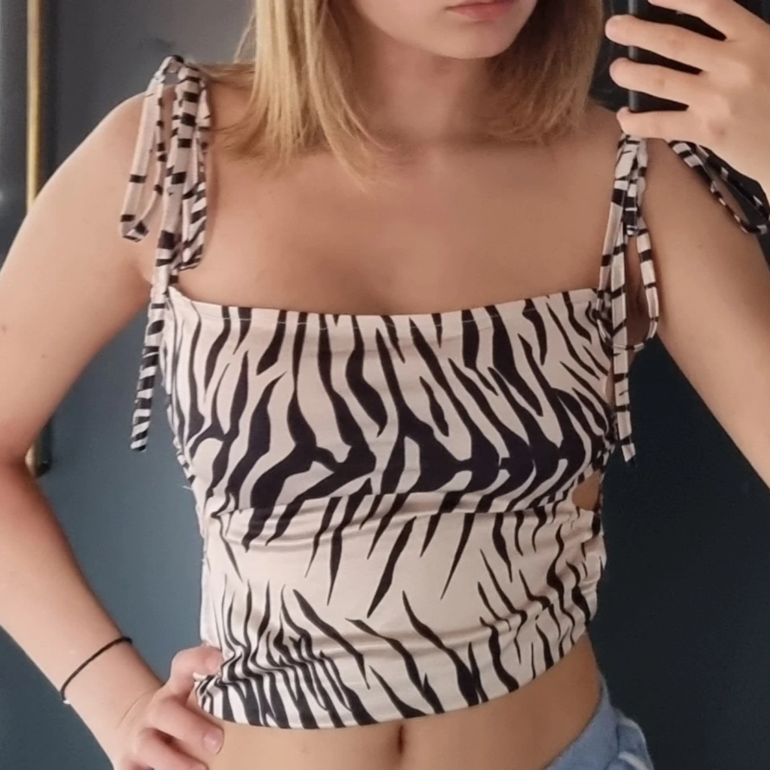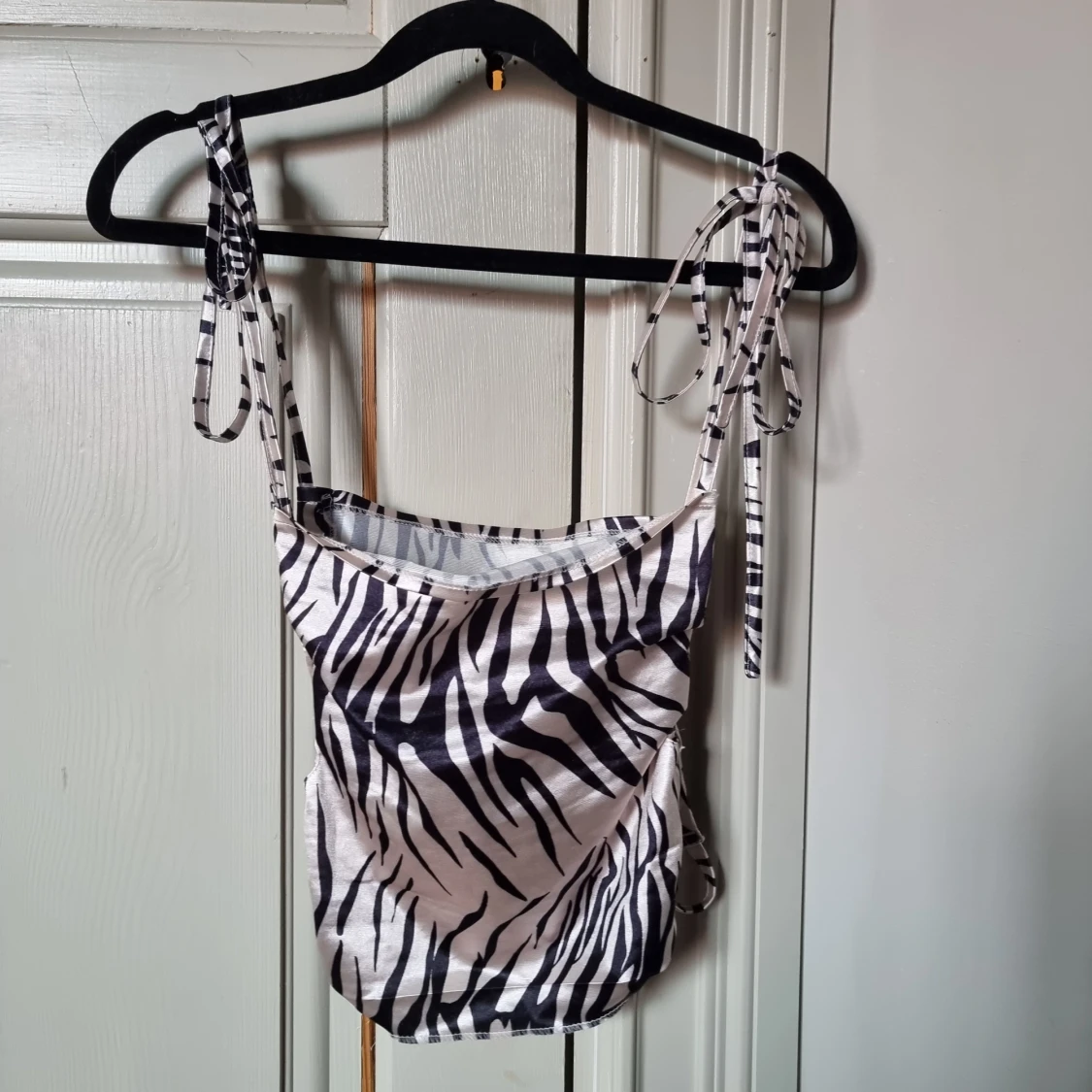 En jättefin silkestopp iach med zebramönster. Snörning på sidorna som gör att den går att justera i bredd och längd på axelbanden. Använd en gång.💖🌸