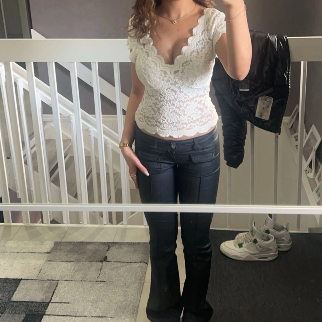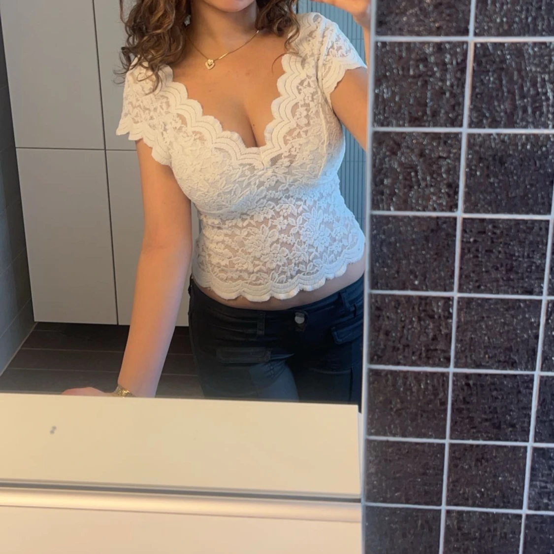 Säljer en vacker vit spetsblus med v-ringning och volangdetaljer. Blusen är figurnära och har korta ärmar.