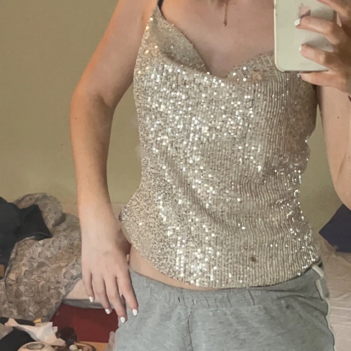 Säljer denna snygga glittriga topp. Aldrig använd och inga defekter på. Har dock sytt där bak då jag har gjort toppen som ett linne, innan var det ett kors med banden där bak men inget man ser då jag tycker att den är snyggare så. Priset kan diskuteras💓
