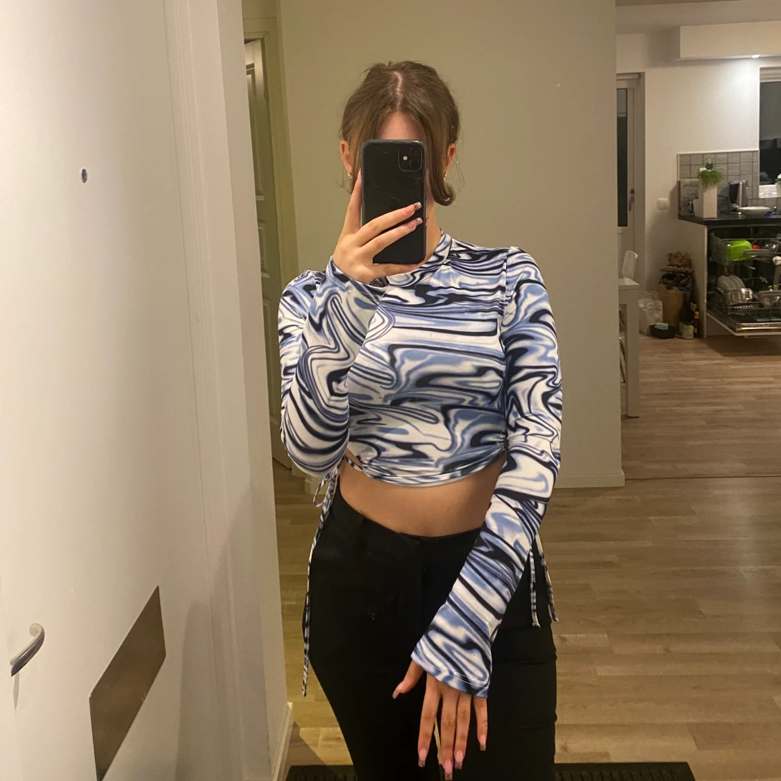 Blå mönstrad topp med knytbara snören på sidorna. I storlek XS