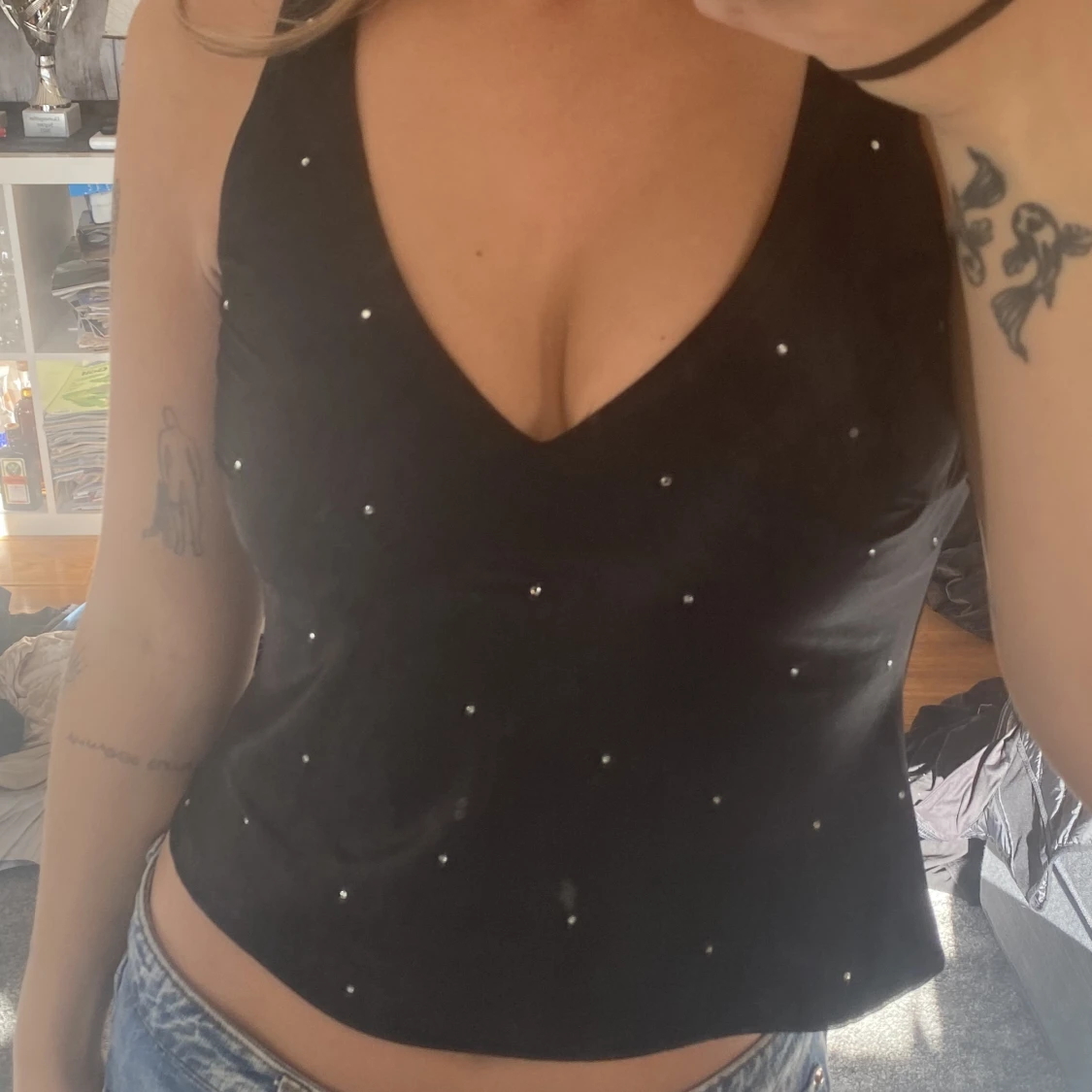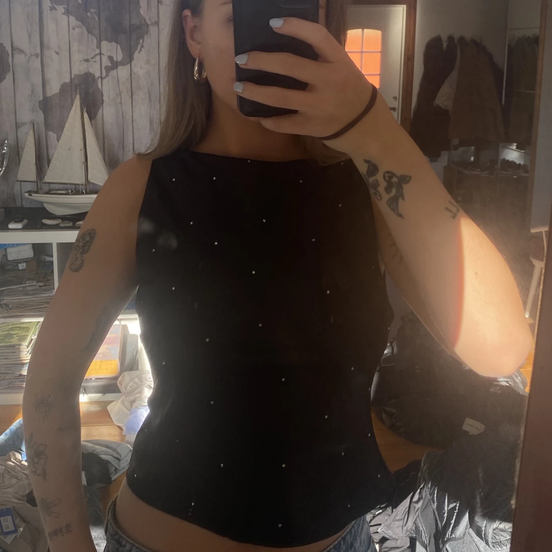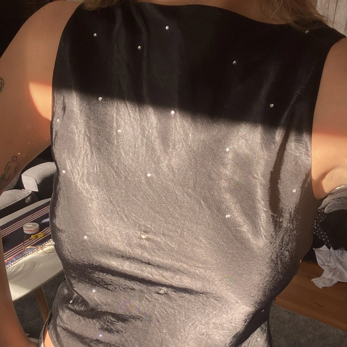 Strl 34, passar 36 också. Satintopp med diamanter över hela! Går att bära åt två håll!