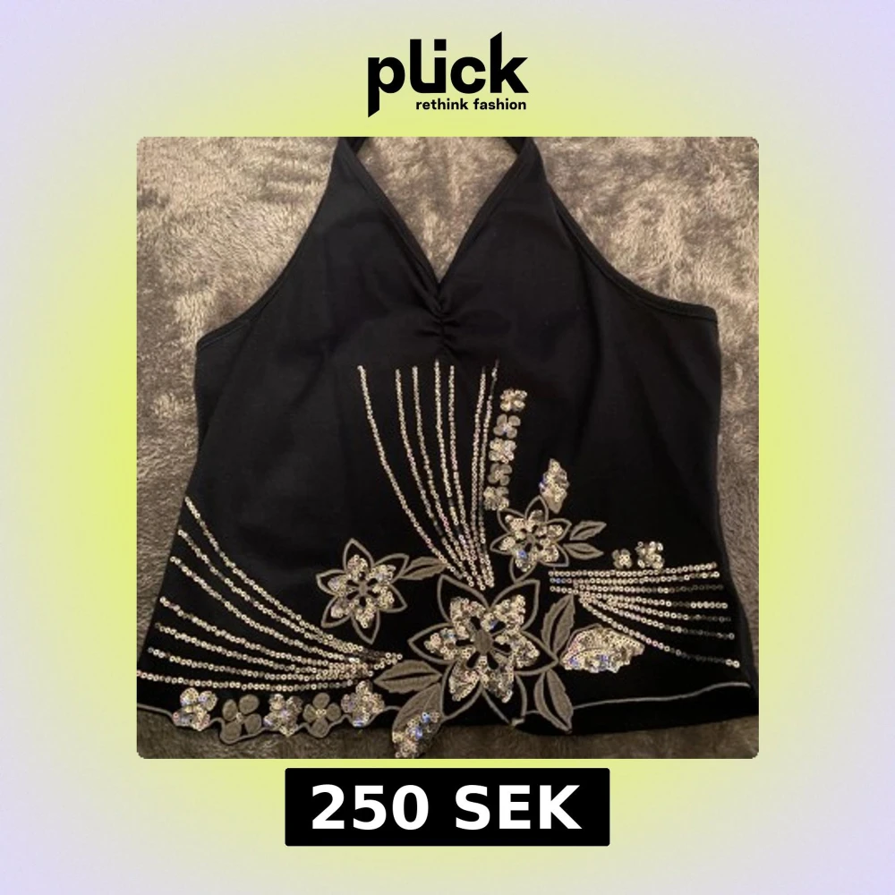Snygg svart halterneck topp med v-ringning och dekorativa paljetter i blommönster. Perfekt för en kväll ute eller festliga tillfällen. Toppen knyts i nacken och har en elegant design.