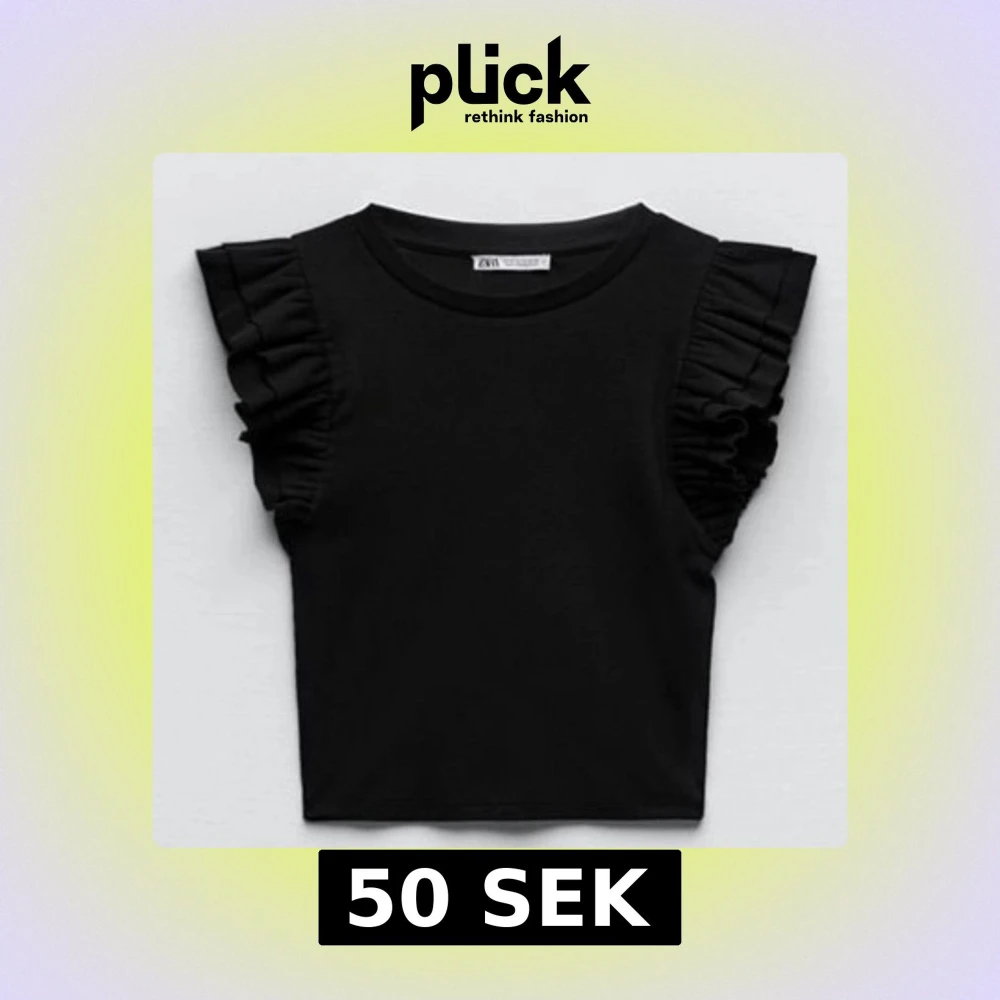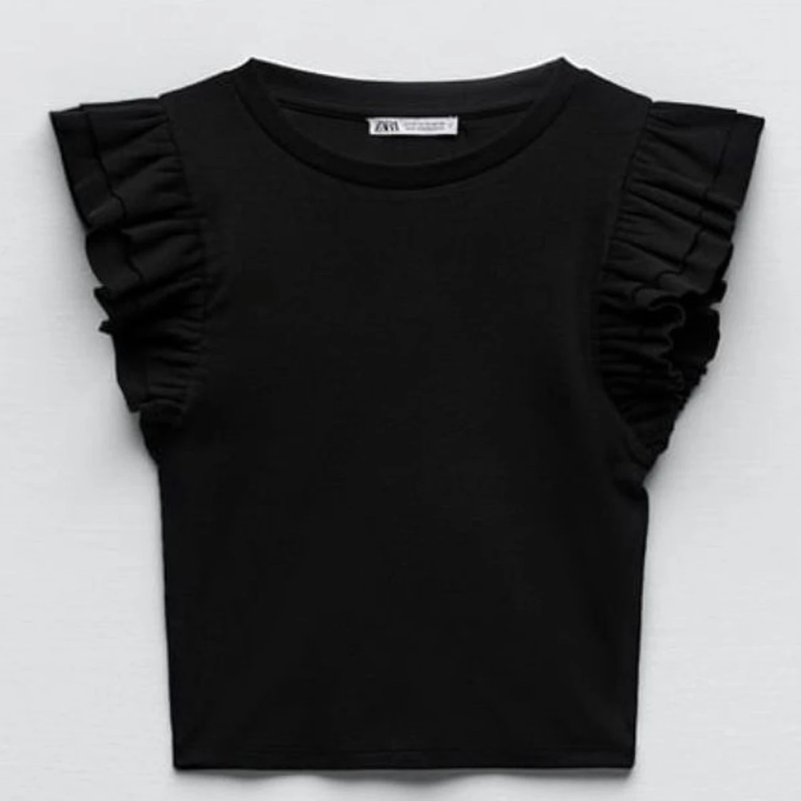 Svart topp från Zara med rund halsringning och volangdetaljer på axlarna. ärmlös och har en croppad passform.