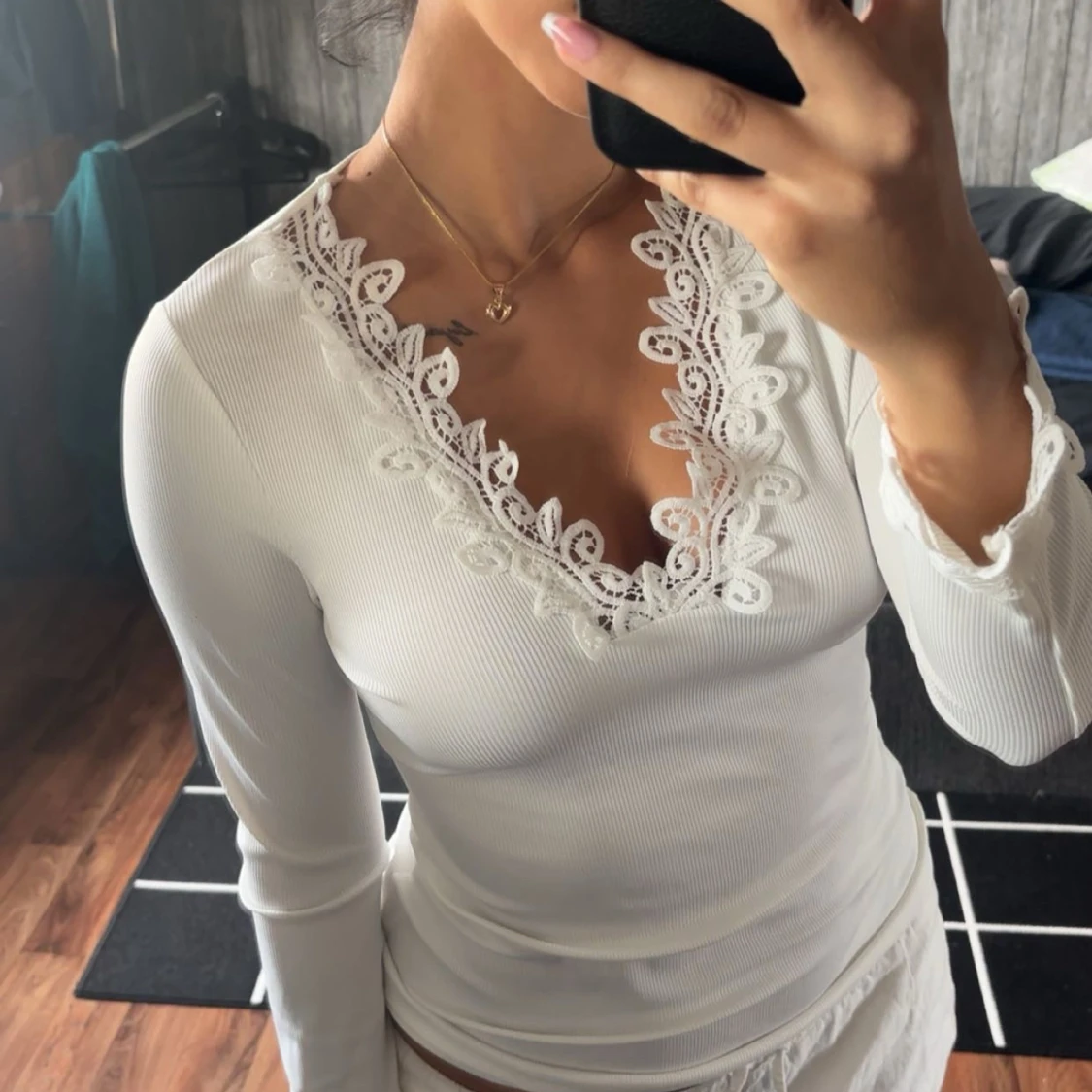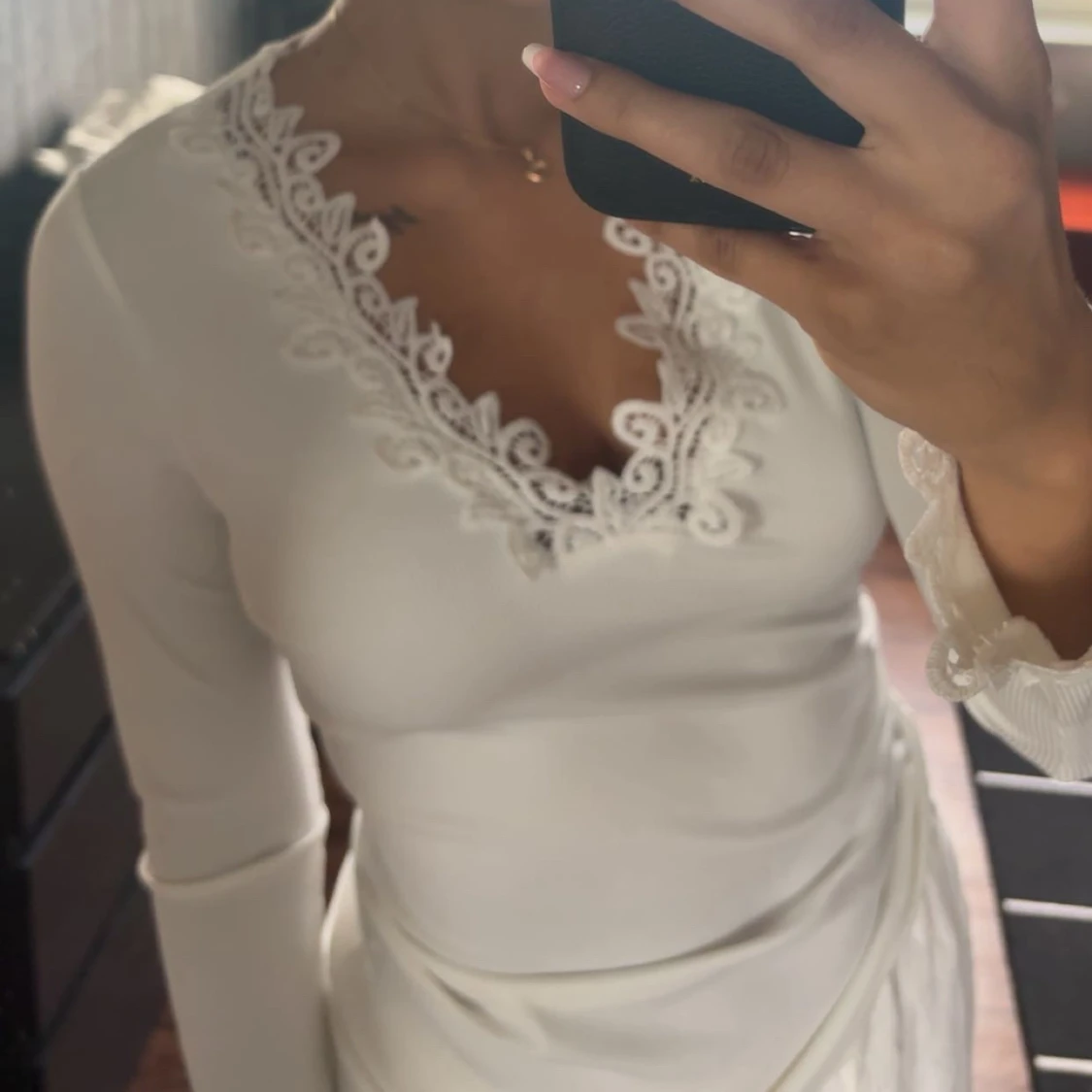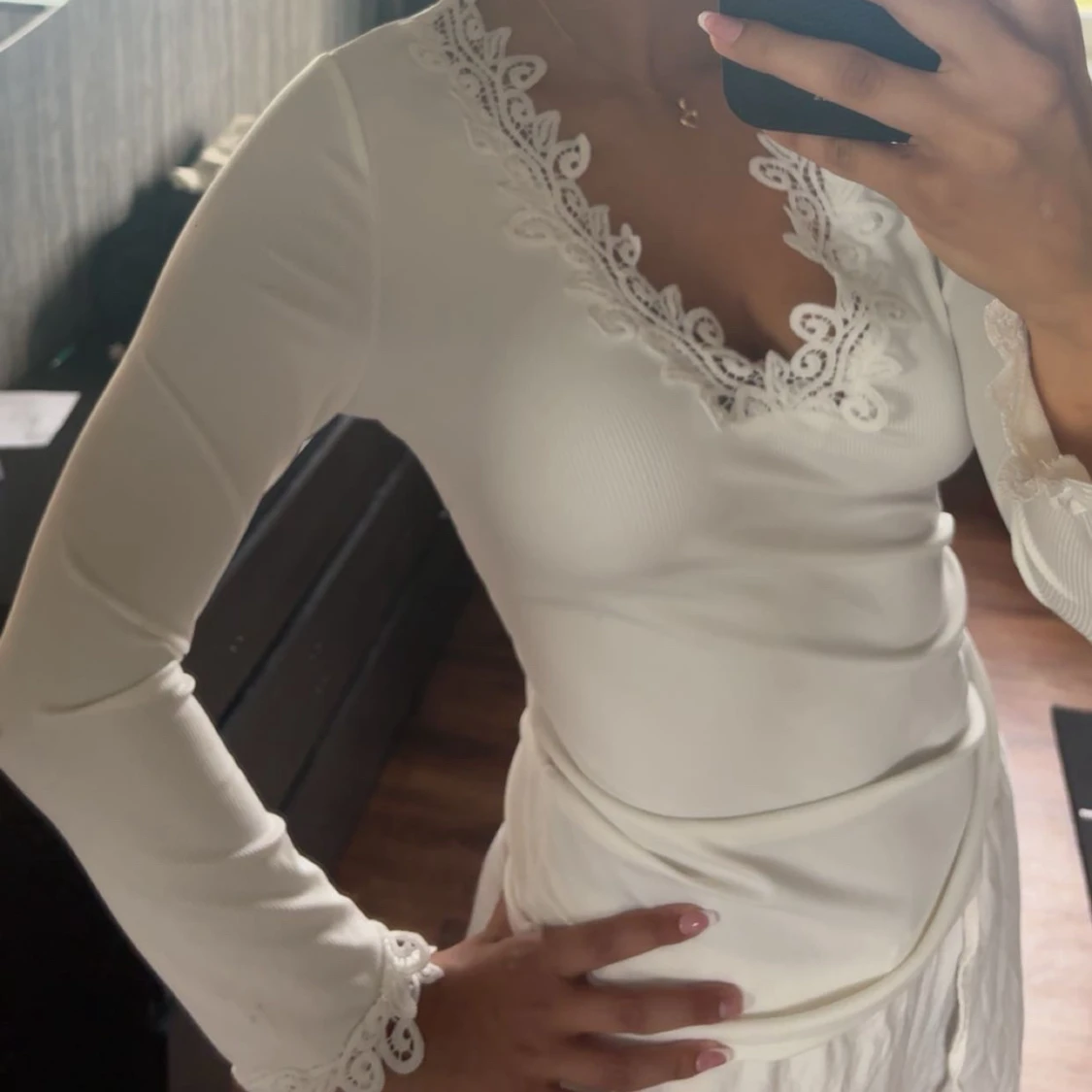Supersöt vit långärmad topp med ribbad struktur och v-ringning dekorerad med spets runt halsen och ärmsluten. Har aldrig kommit till användning och är köpt från Zara💕