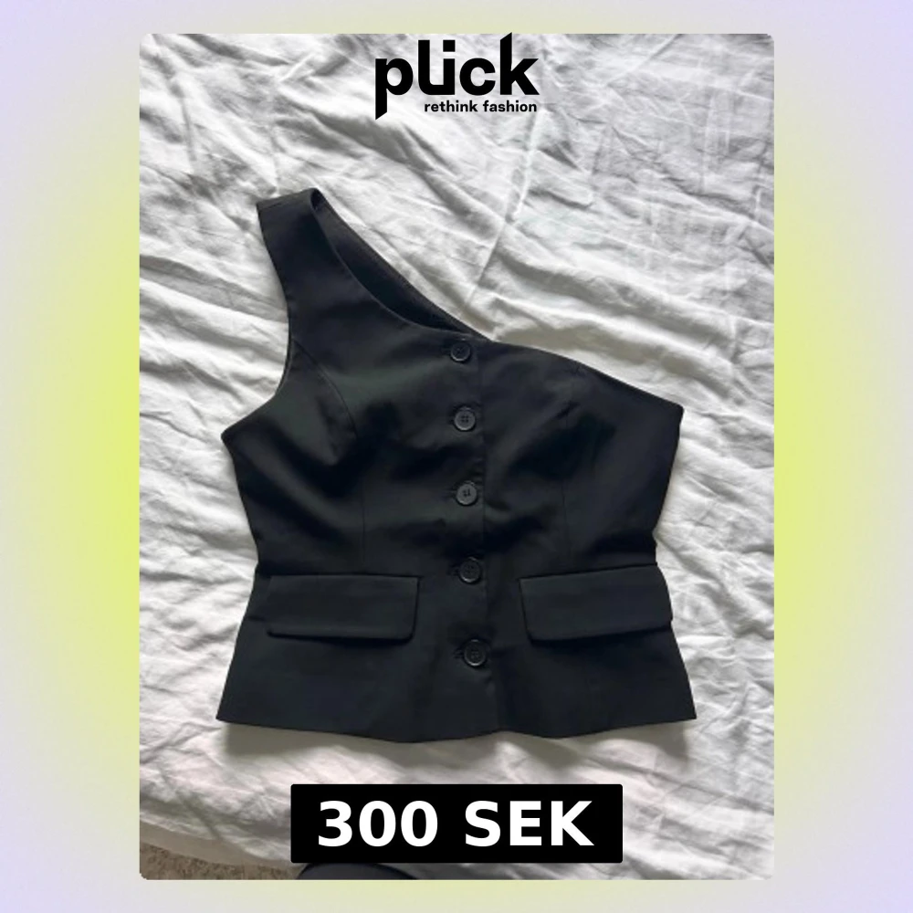Säljer en svart korsettliknande topp med oneshoulder-design och fem knappar framtill. Toppen har två dekorativa fickor och är figursydd för en snygg passform. Materialet är slätt och känns som polyester. Perfekt för dig som gillar stilrena och unika plagg.