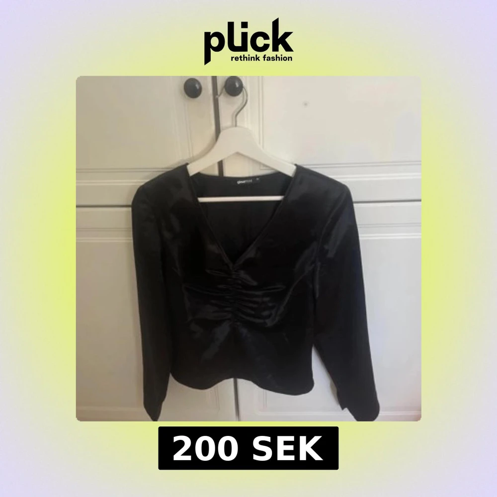Säljer en elegant svart glansig topp från Gina Tricot. Toppen har en v-ringning och långa ärmar, perfekt för en stilren look. Passar utmärkt till både fest och vardag. 🖤