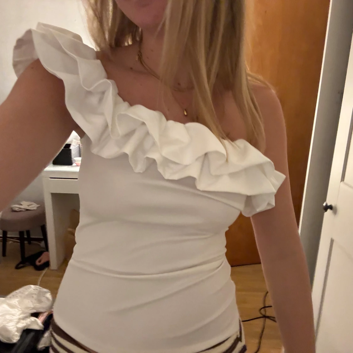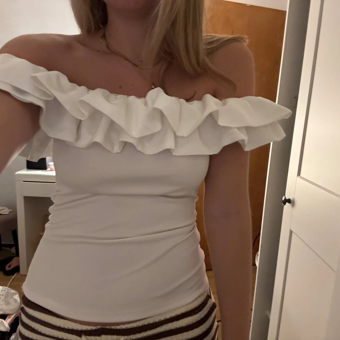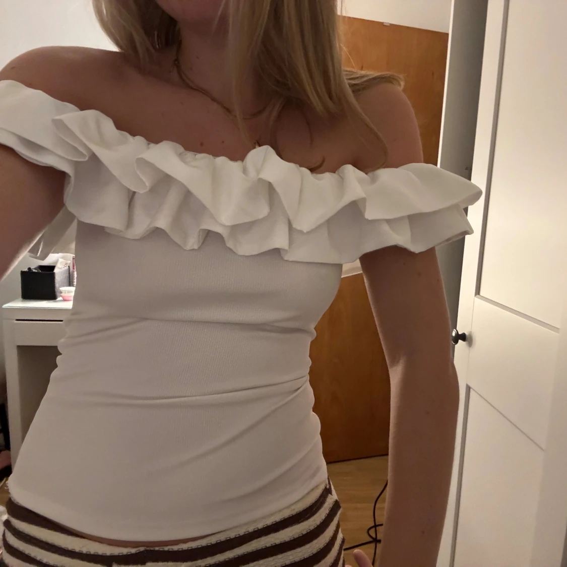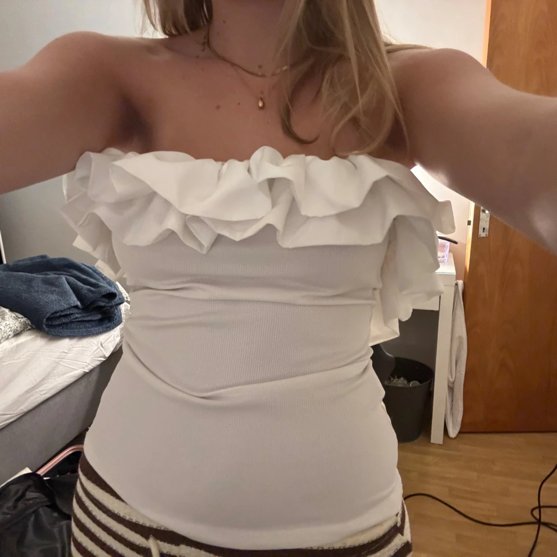 Supersnygg vit tubtopp med bred volang upptill som går runt hela axelpartiet. Offshoulder och axelbandslös design, sitter tight och har en mjuk, stretchig känsla. Perfekt för dig som vill ha en trendig och feminin look med extra volym upptill.