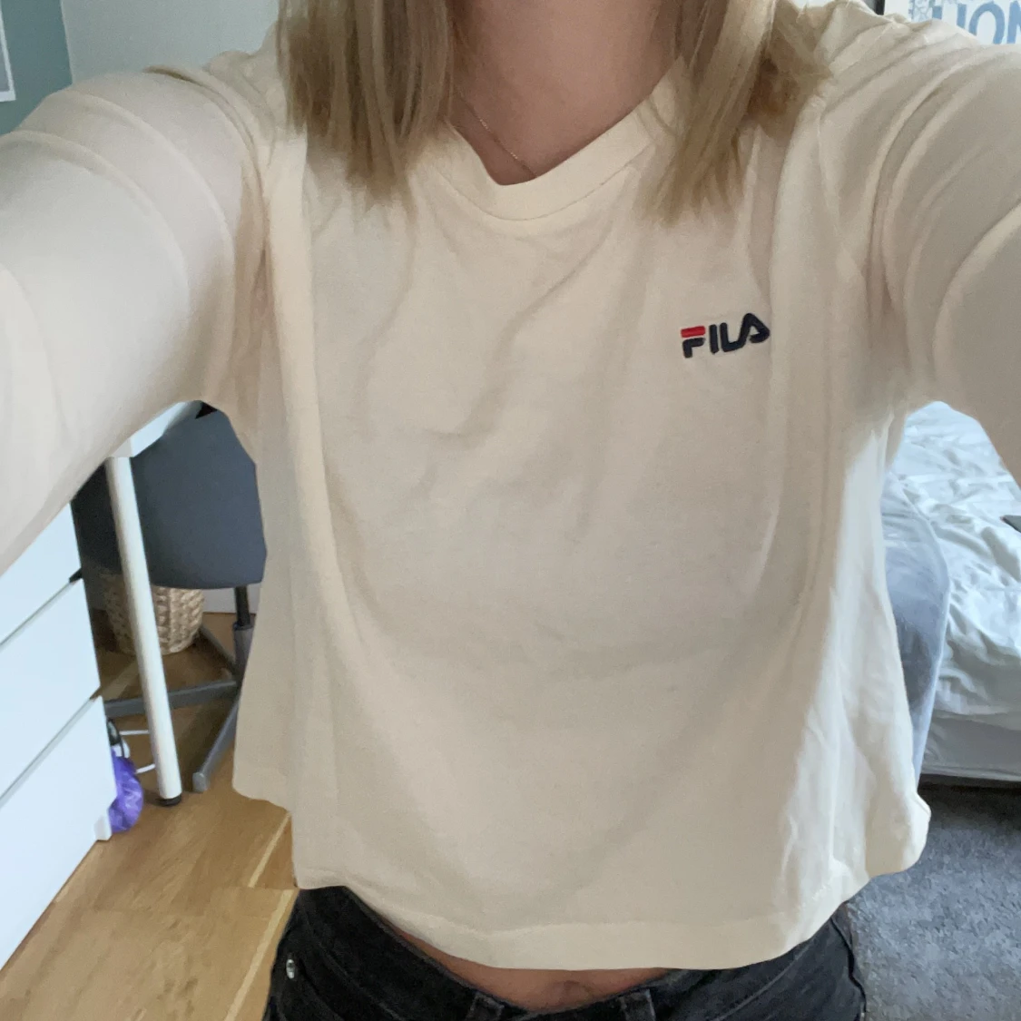 En slitsnygg tröja från Fila. Färgen är vit men går åt det beiga hålet så typ äggskalsvit. Lite kortare i modellen, true to size. Orginalpris: 349kr