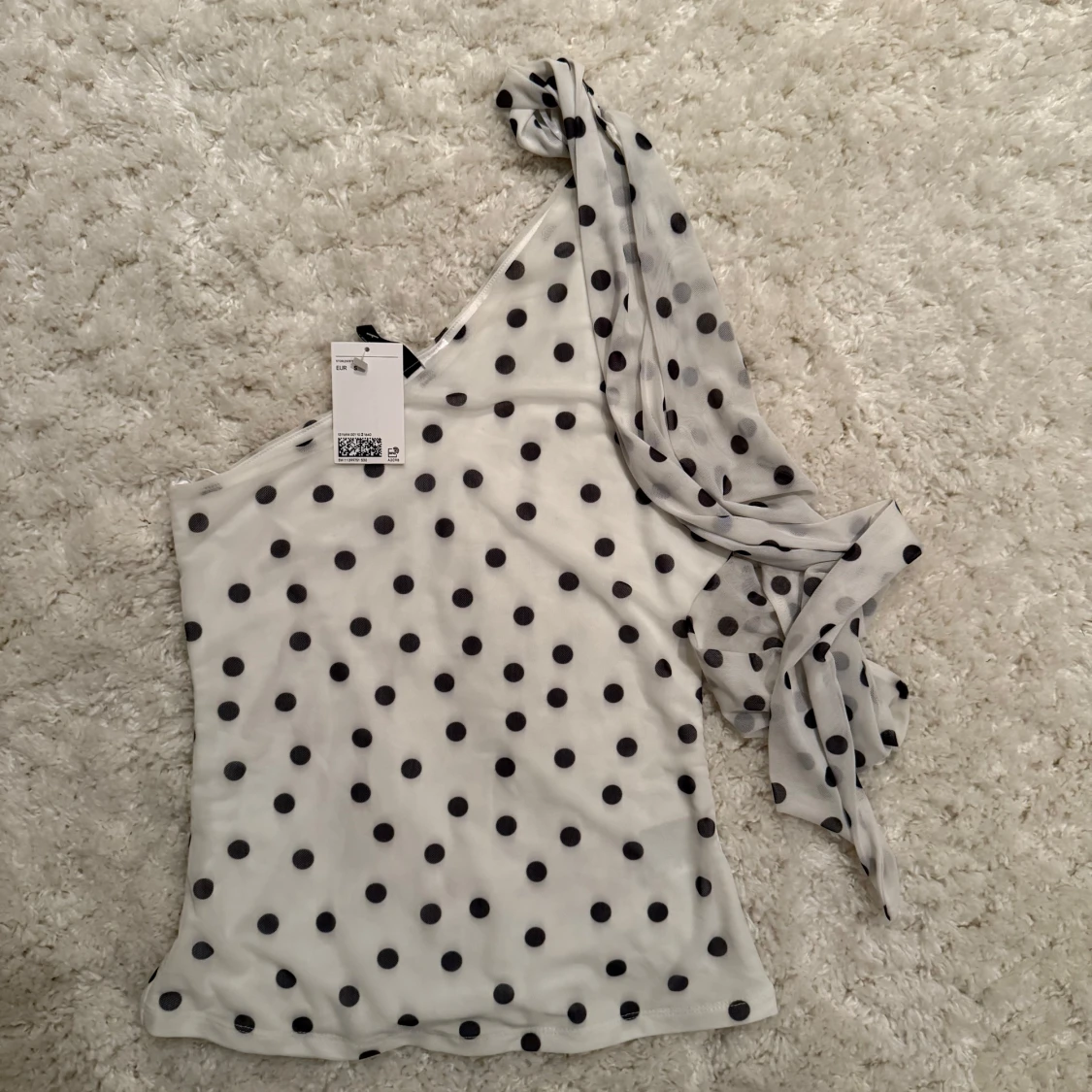 Superfin vit oneshoulder topp från H&M med svarta prickar och lång knytband på axeln. Snygg asymmetrisk design och lätt, mjukt material som känns skönt mot huden.