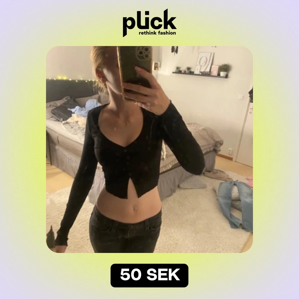 Säljer en svart croppad topp med knappar framtill. Toppen har långa ärmar och en tight passform, perfekt för en kväll ute eller en casual dag. Den är både stilren och bekväm!