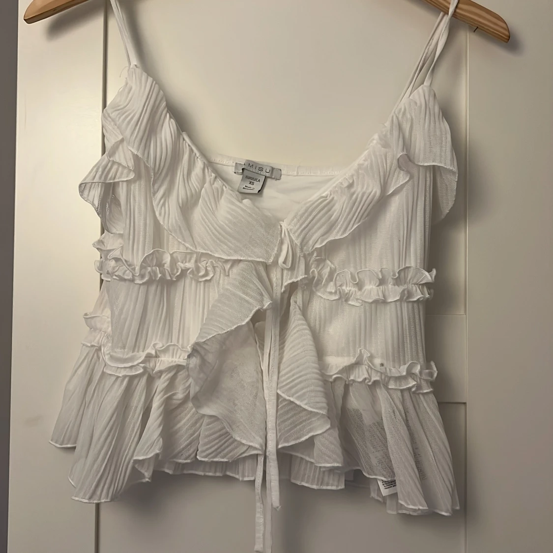 Supersöt vit linnetopp från Missu med tunna axelband, volanger och knyt framtill. Toppen har ett lätt ribbat tyg och flera lager volanger som ger en romantisk vibe. Perfekt för varma dagar när du vill känna dig extra fin. Oanvänd