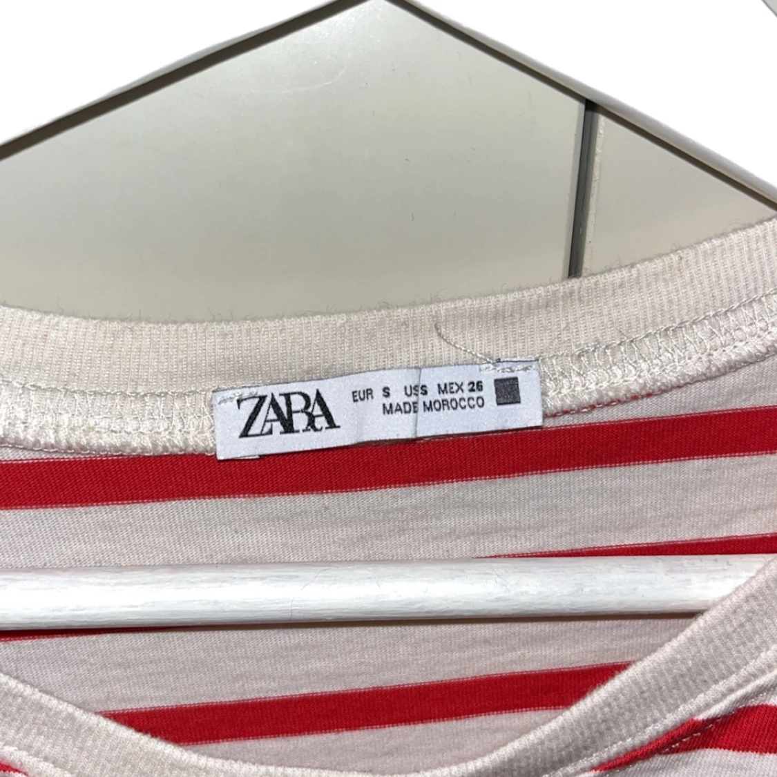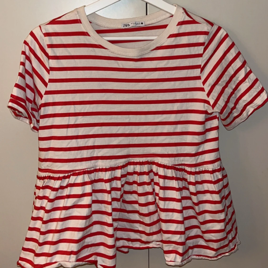 Säljer en söt randig topp från Zara i rött och vitt. Toppen har korta ärmar och en volangdetalj vid midjan som ger en fin form. Perfekt för en avslappnad stil.
