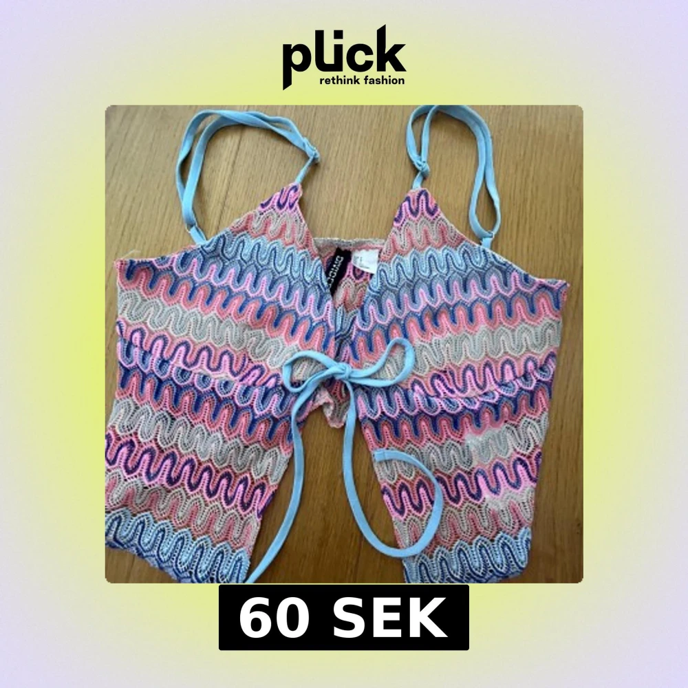 Säljer en färgglad strandtopp från divided i missoni liknanade mönster. Toppen har smala axelband och en knytning framtill. Perfekt inför sommaren. Är något liten i storleken.