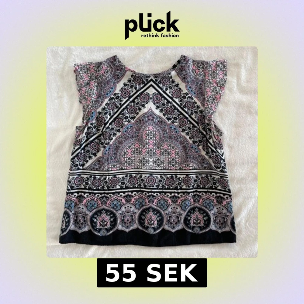 Säljer en snygg blus från Oasis med orientaliskt inspirerat mönster i svart, rosa, blått och vitt. Blusen har korta ärmar och en liten knappdetalj i nacken. Perfekt för dig som gillar färg och mönster! Prislappen sitter löst men annars är den i mycket bra skick!
