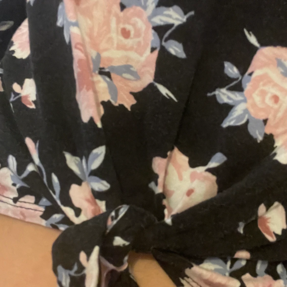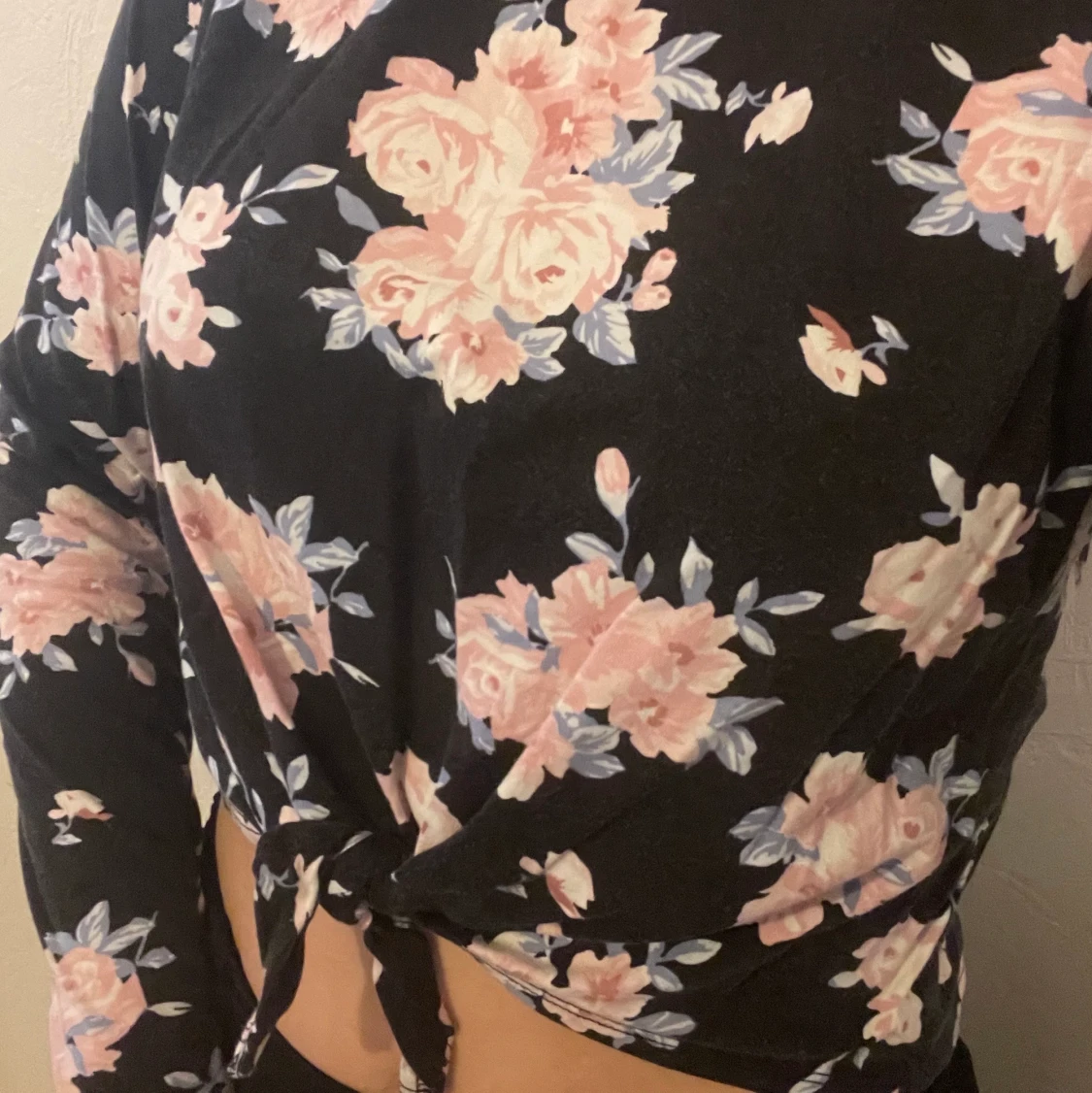 Blommig, Långärmad croppad tröja som knyts framtill 💙 använd några gånger men i väldigt fin skick💛 väldigt skön material 🌻☺️ 85 + frakt som kan tillkomma