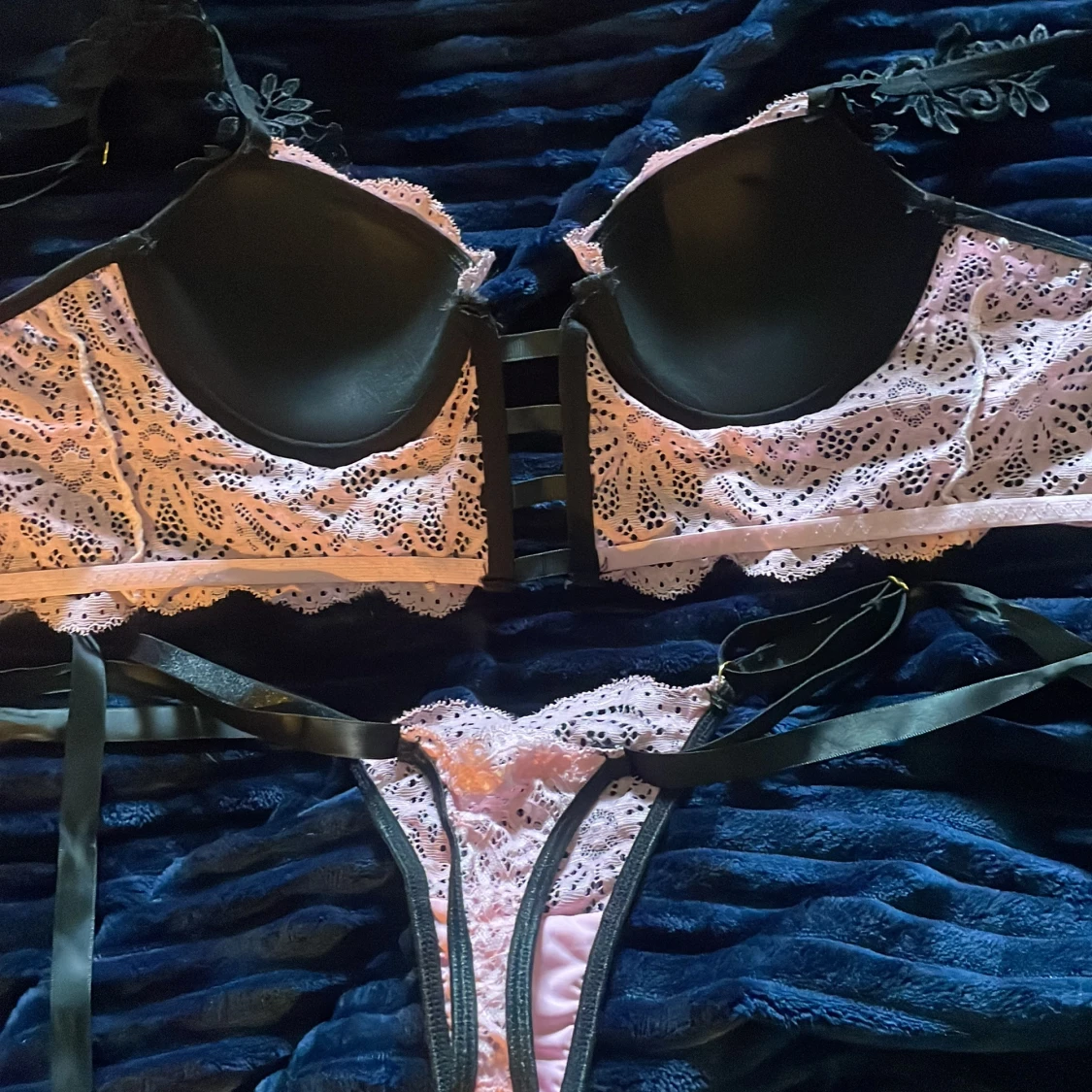 Säljer en snygg rosa bh med svart spets och coola banddetaljer. Toppen har vadderade kupor, blommigt spetsmönster och svarta kanter som ger en edgy look. Perfekt för dig som vill sticka ut och känna dig extra fin.