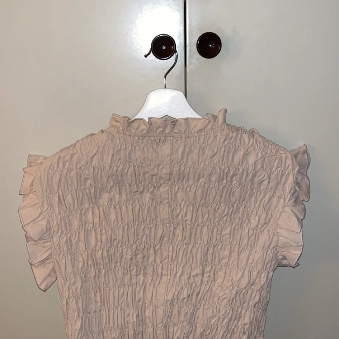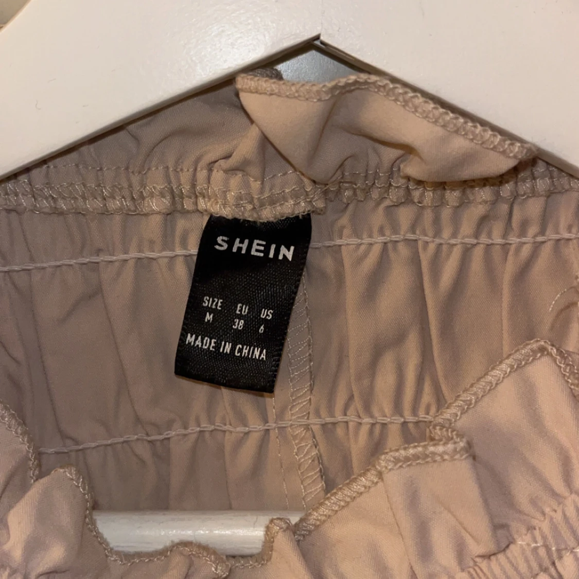 Säljer en söt beige blus från Shein med volangdetaljer. Blusen har en rynkad design och korta ärmar med volanger vid ärmslut och hals. Perfekt för en stilren look.
