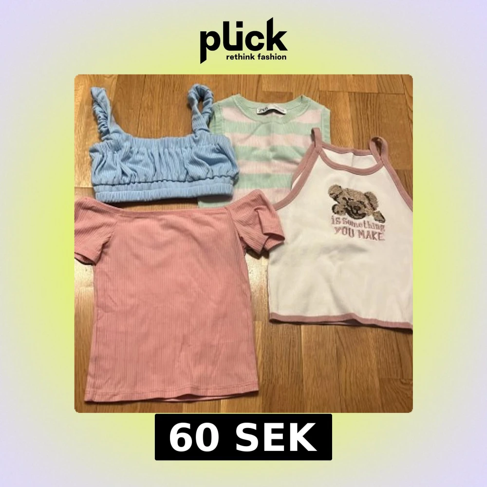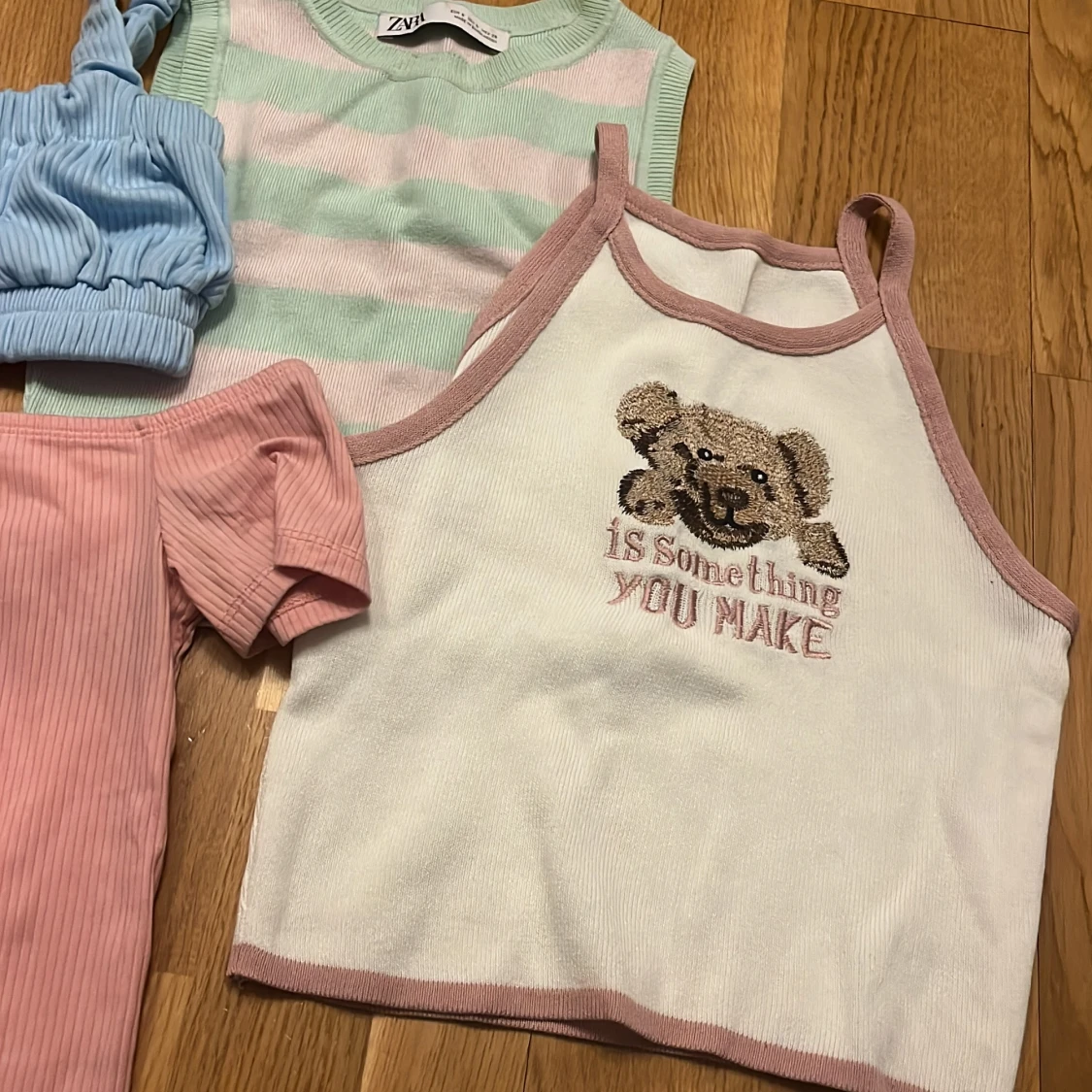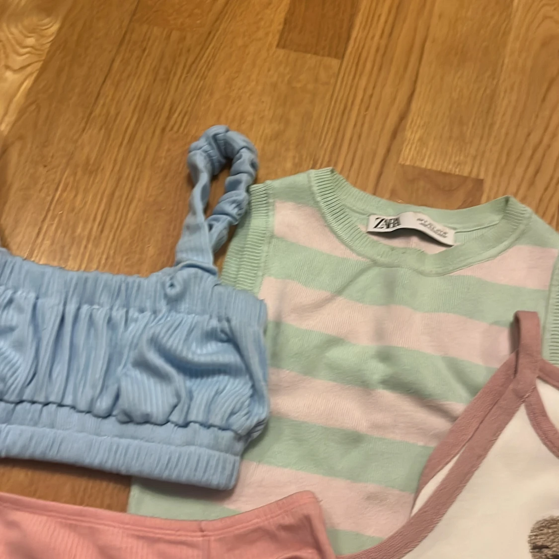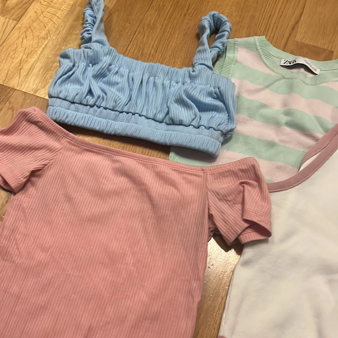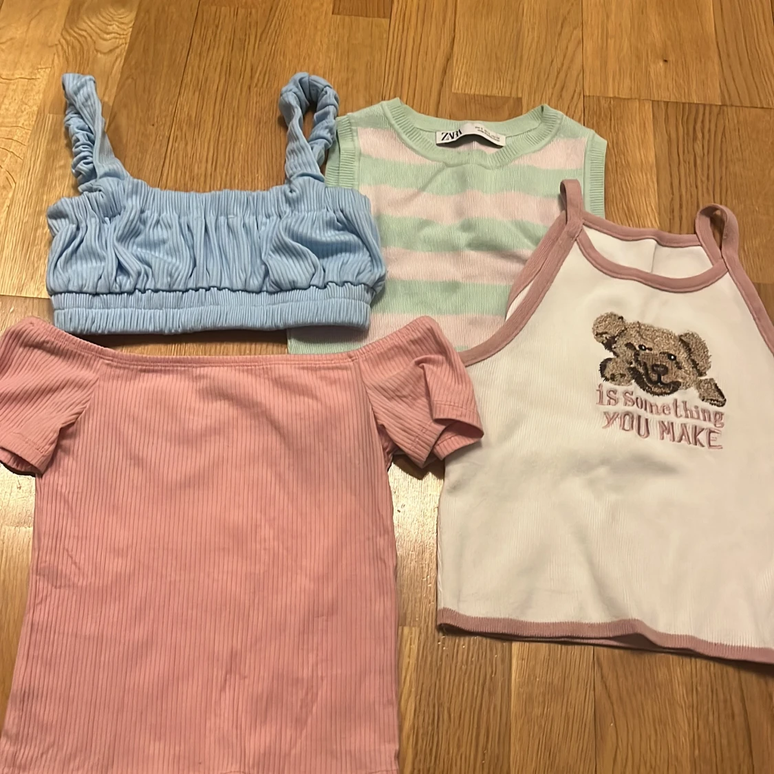 Säljer fyra snygga toppar: en blå croppad topp med rynkade axelband, en mintgrön och rosa randig ärmlös topp från Zara, en rosa ribbad offshoulder-topp och en vit linne med rosa kanter och nallemotiv. Perfekta för sommardagar!