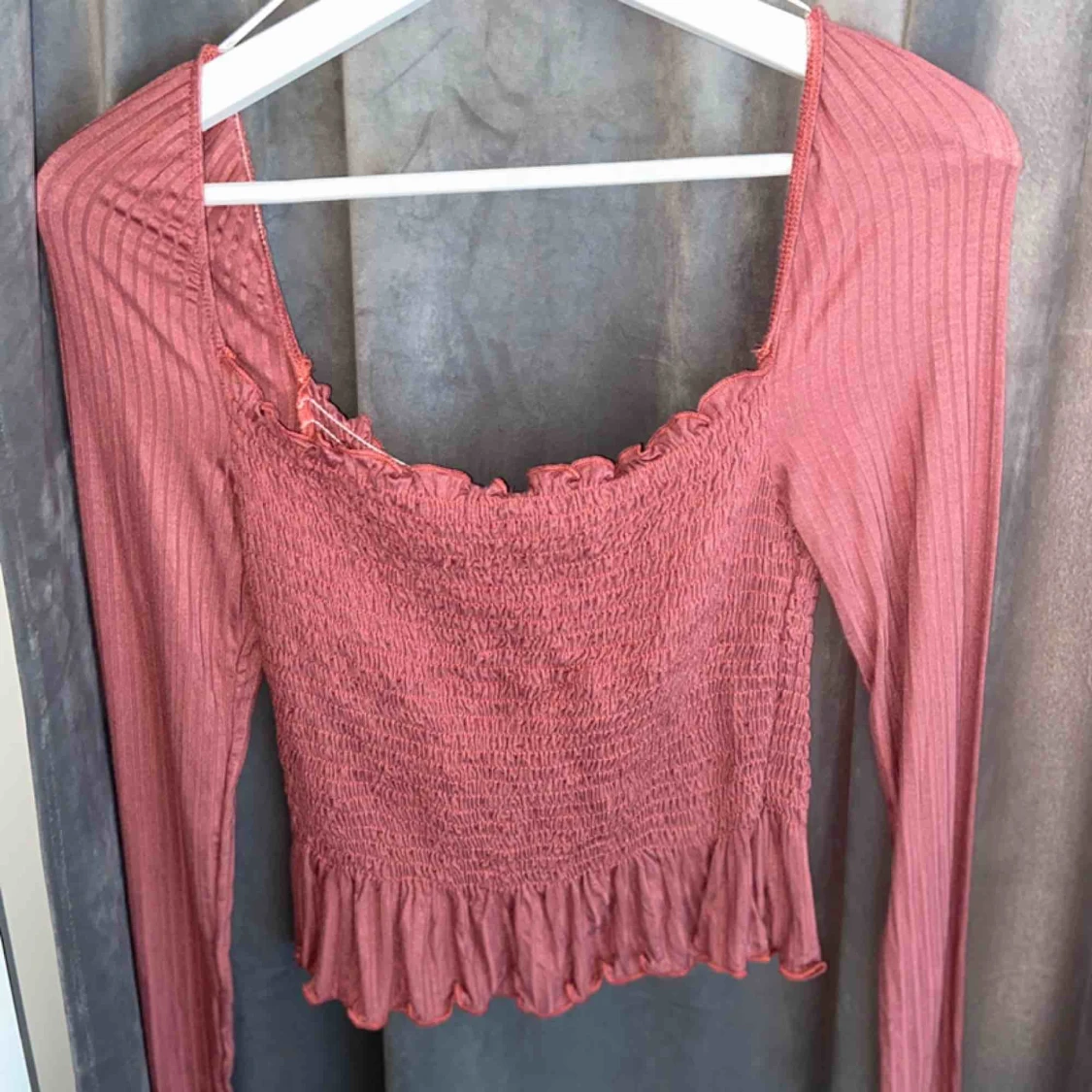 Det här är en gammelrosa tröja med lite av resår på magen och ryggen men ”riktigt” tyg på armarna. Den här tröjan är i ett jättefint skick, aldrig använd. Den passar superbra till alla tillfällen då den inte är så tajt utan ganska stretchig i tyget.