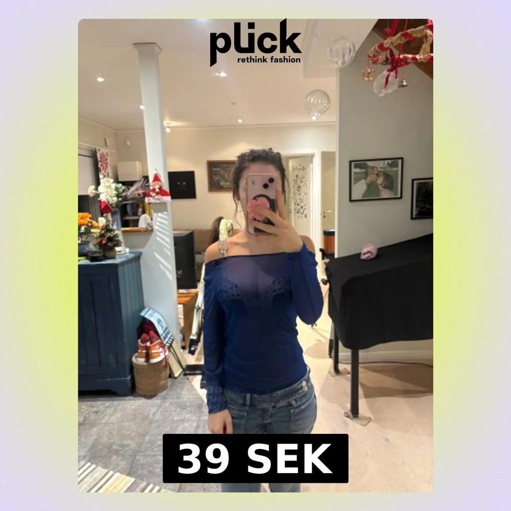 Säljer en mörkblå mesh topp med offshoulder-modell och långa ärmar. Toppen är genomskinlig och har en smickrande passform som sitter tight mot kroppen.