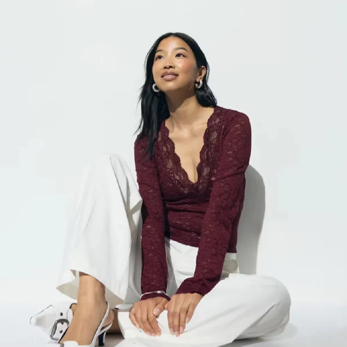Säljer en vinröd blus från gina med v-ringad hals och långa ärmar. Blusen är helt i spets med blommigt mönster och har en croppad passform som ger en snygg siluett. Perfekt för dig som gillar detaljer och vill sticka ut.