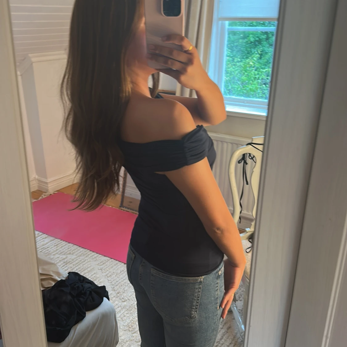 Snygg svart offshoulder topp med twistad detalj framtill. Sitter tight och har en croppad känsla, perfekt till jeans eller kjol. Tunn och stretchig, troligen i polyester eller syntet. Ger en cool och stilren vibe.