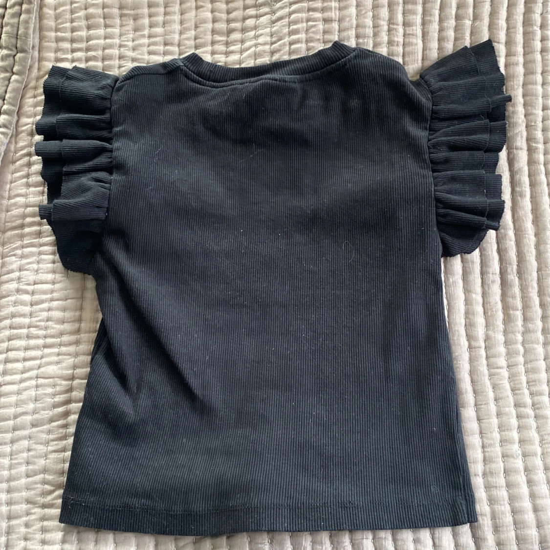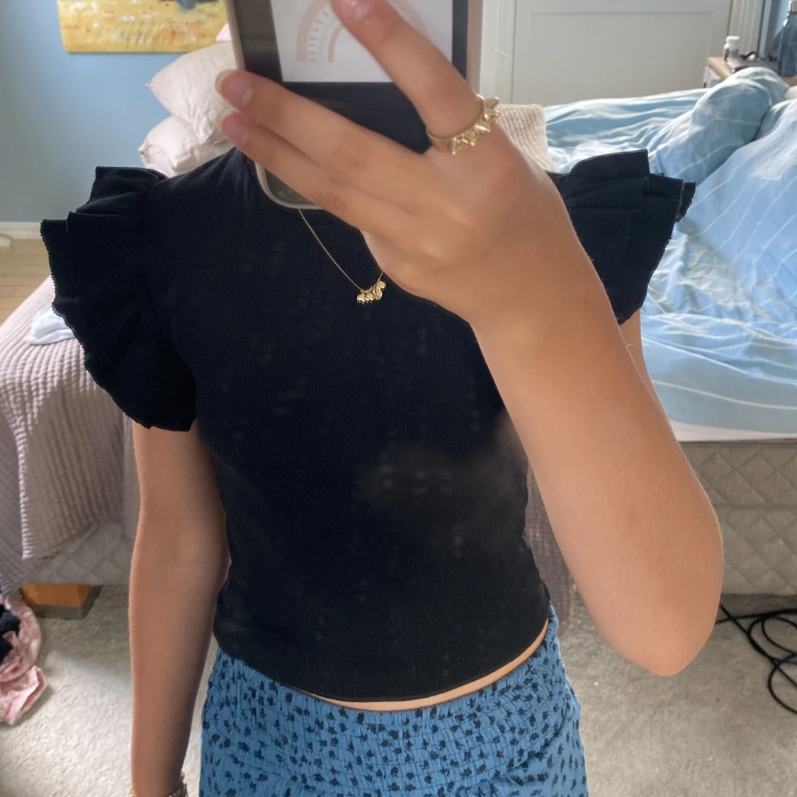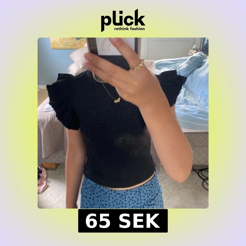 Supersöt svart topp från Gina Tricot med ribbad struktur och volangärmar som ger en extra cool touch. Modellen är croppad och har rund hals. Perfekt för dig som vill ha något stilrent och trendigt!
