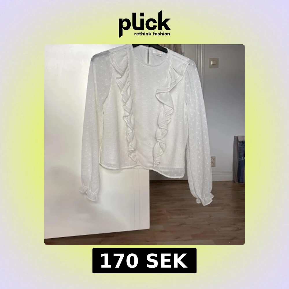 Supersöt vit blus från Gina Tricot med volangdetaljer framtill och diskret prickigt mönster i tyget. Blusen har långa ärmar med resår och liten volang vid ärmslut. Perfekt för dig som gillar romantisk och trendig stil.