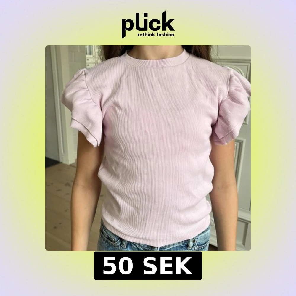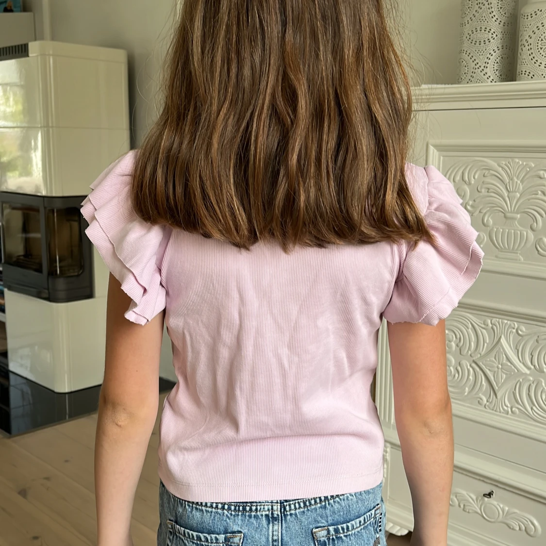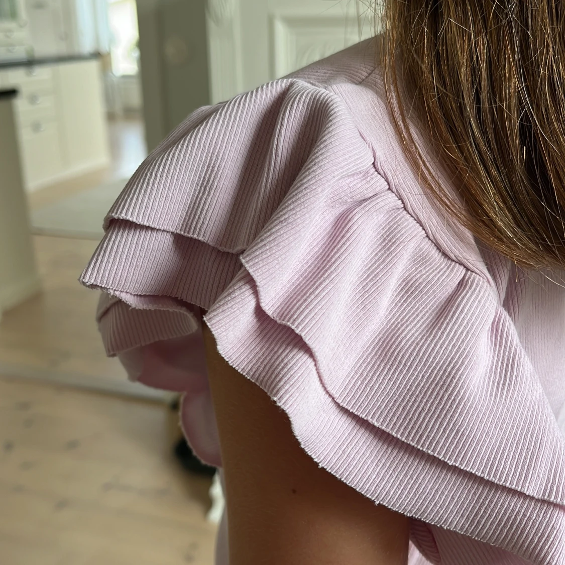 Supersöt ljusrosa topp med korta volangärmar och ribbad struktur. Toppen har rund halsringning och är figurnära utan att vara tight. Perfekt för dig som gillar en feminin och trendig stil. Materialet känns mjukt och stretchigt.