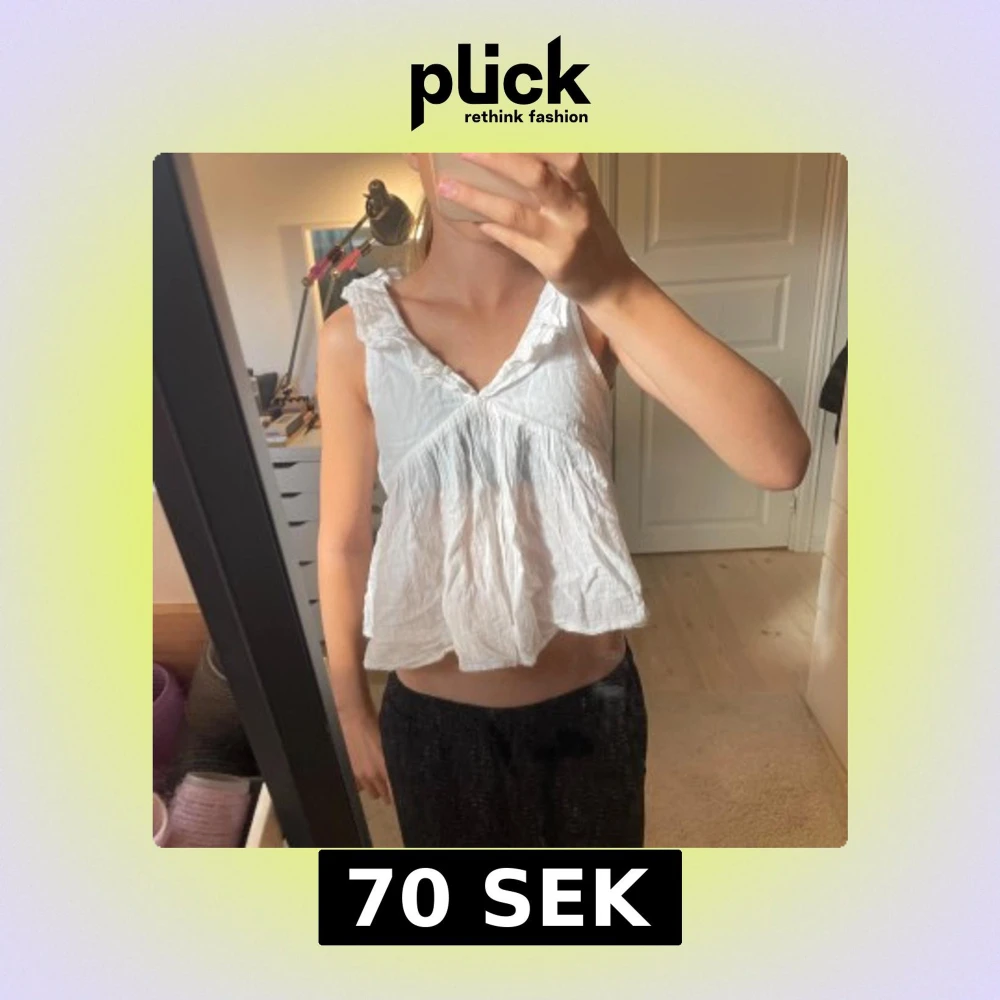 Supersöt vit linnetopp från Gina Tricot med volangdetaljer längs axelbanden och v-ringning. Toppen är luftig och har knytband i ryggen. Perfekt för varma dagar och ger en romantisk vibe till din outfit.