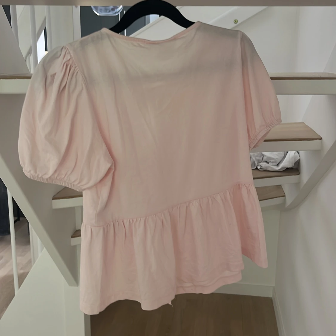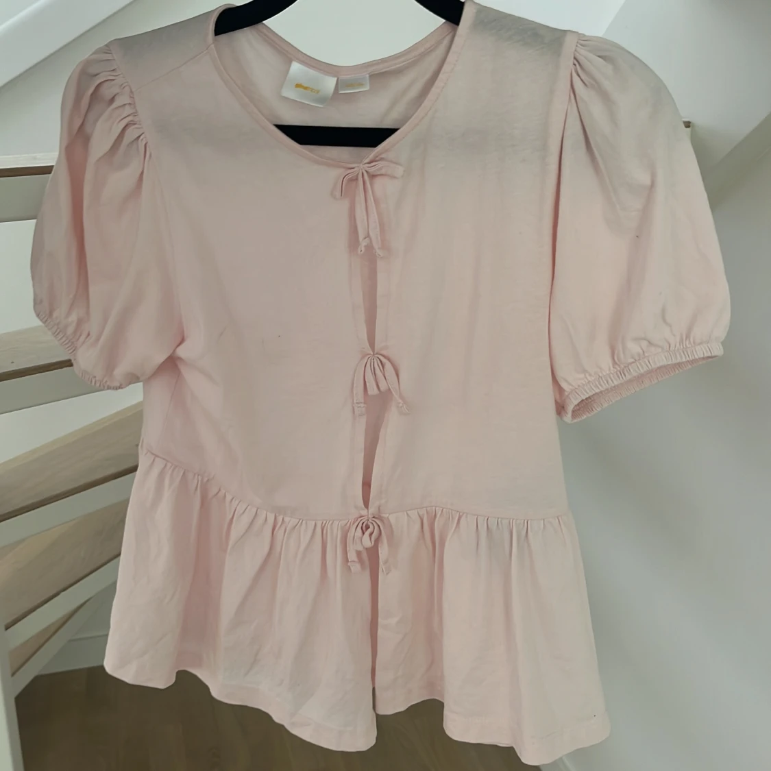 Supersöt ljusrosa blus från Gina Tricot med puffiga korta ärmar och tre rosetter framtill. Den är lite öppen men fu kan ha ett linne under!