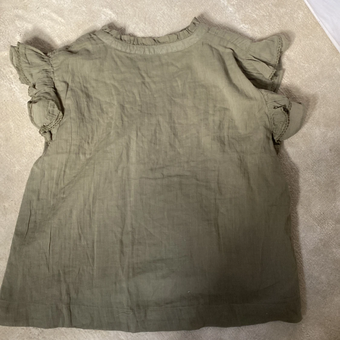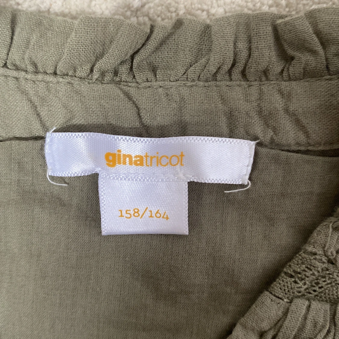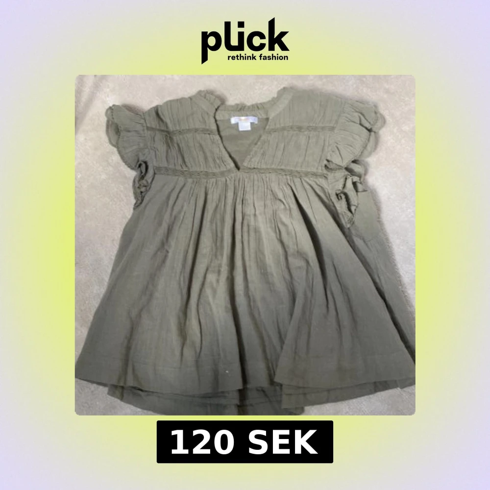 Säljer en olivgrön blus från Gina Tricot i storlek 158/164. Blusen har volangdetaljer vid ärmarna, v-ringning och är tillverkad i ett lätt och luftigt tyg. Har inte använt innan