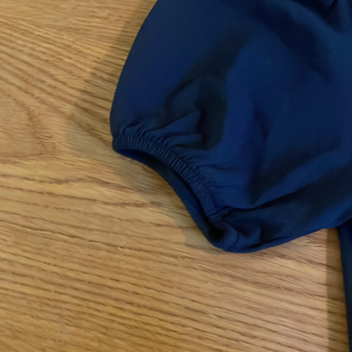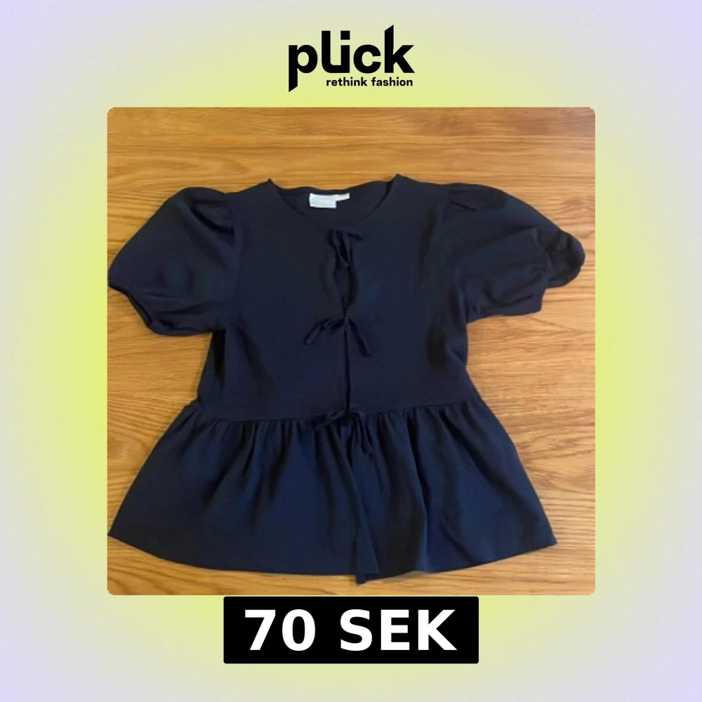 Supersöt mörkblå blus från Gina Tricot med puffiga korta ärmar och volang nedtill. Blusen har två knytband framtill som ger en extra detalj. Perfekt för dig som gillar en feminin och trendig look.